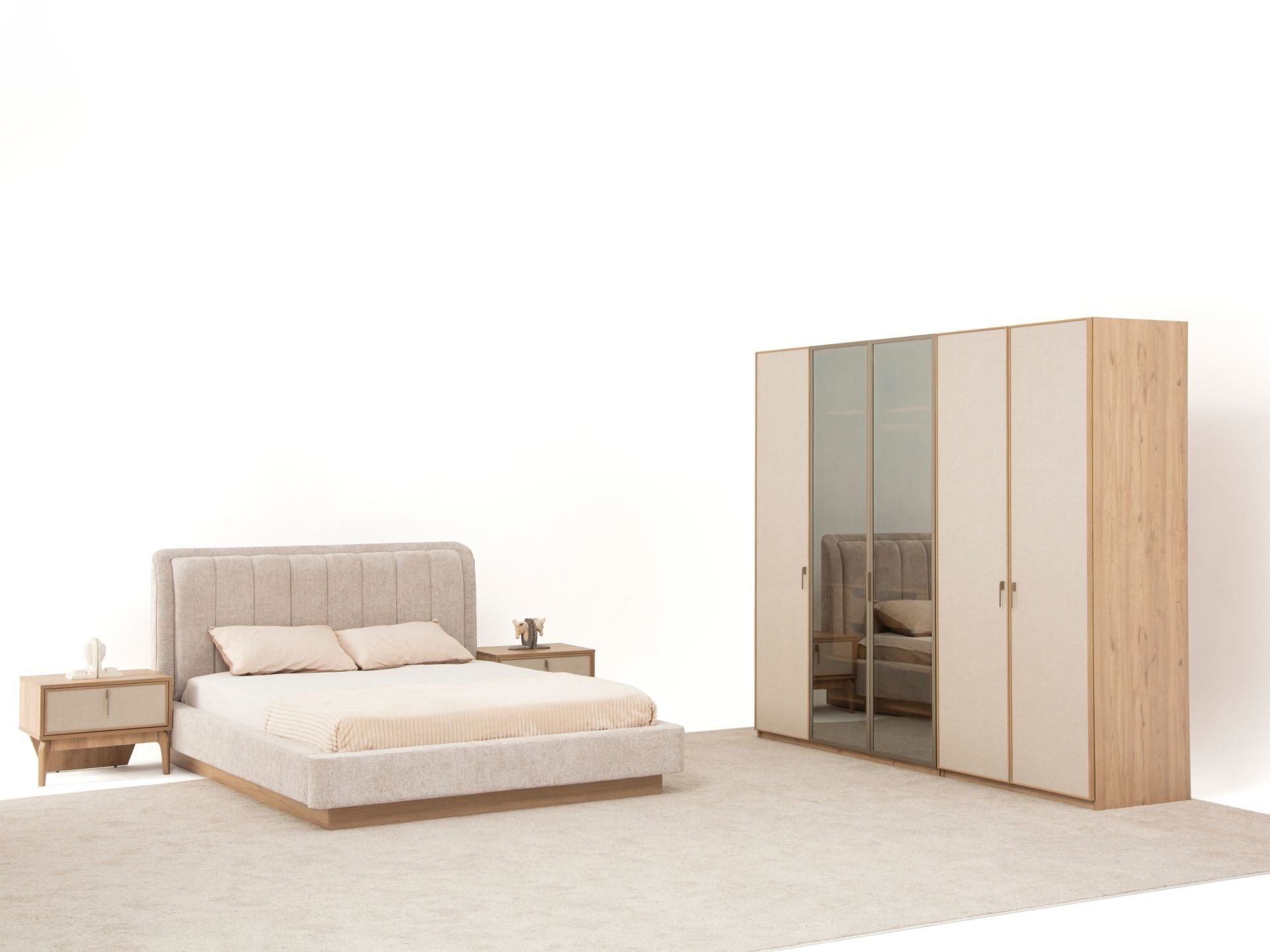 Takım standart içeriği 1 adet 5 kapaklı gardırop,1 adet başlıklı bazalı karyola, 1 adet aynalı şifonyer, 2 adet komodinden müteşekkildir.