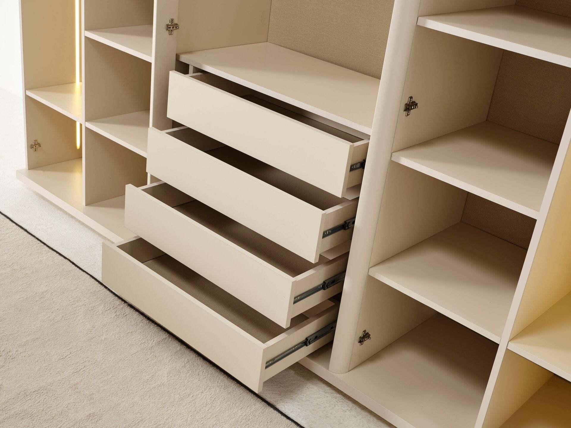 Dolap bir bütün şeklinde imal edilmektedir. Ahşap kapaklar ve dış görünür yüzeyler 1. sınıf suntelam malzemeden imal edilmiştir. Ahşap kapaklar yeni nesil renk kaplama olarak üretilmiştir. Kabarma ve solma görülmez. Yan yüzeyler de aynı renktedir. Tekli modüller cam kapaklıdır. Aynı şeklide dışarı bakan tarafları da cam çerçeveli olarak imal edilmiştir. Camlı olan kısımlar aynı zamanda LED aydınlatmalıdır. İç bölmede raylı çekmeceler yer alır.
