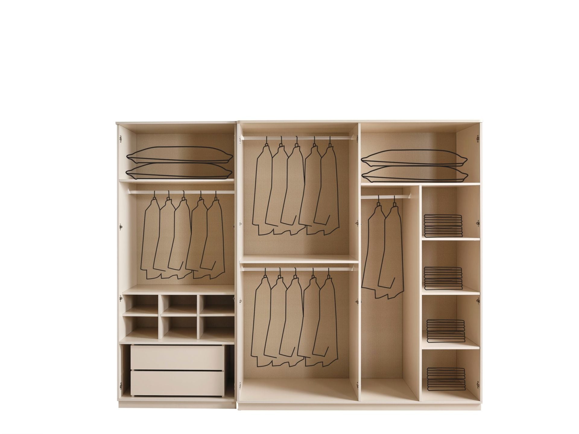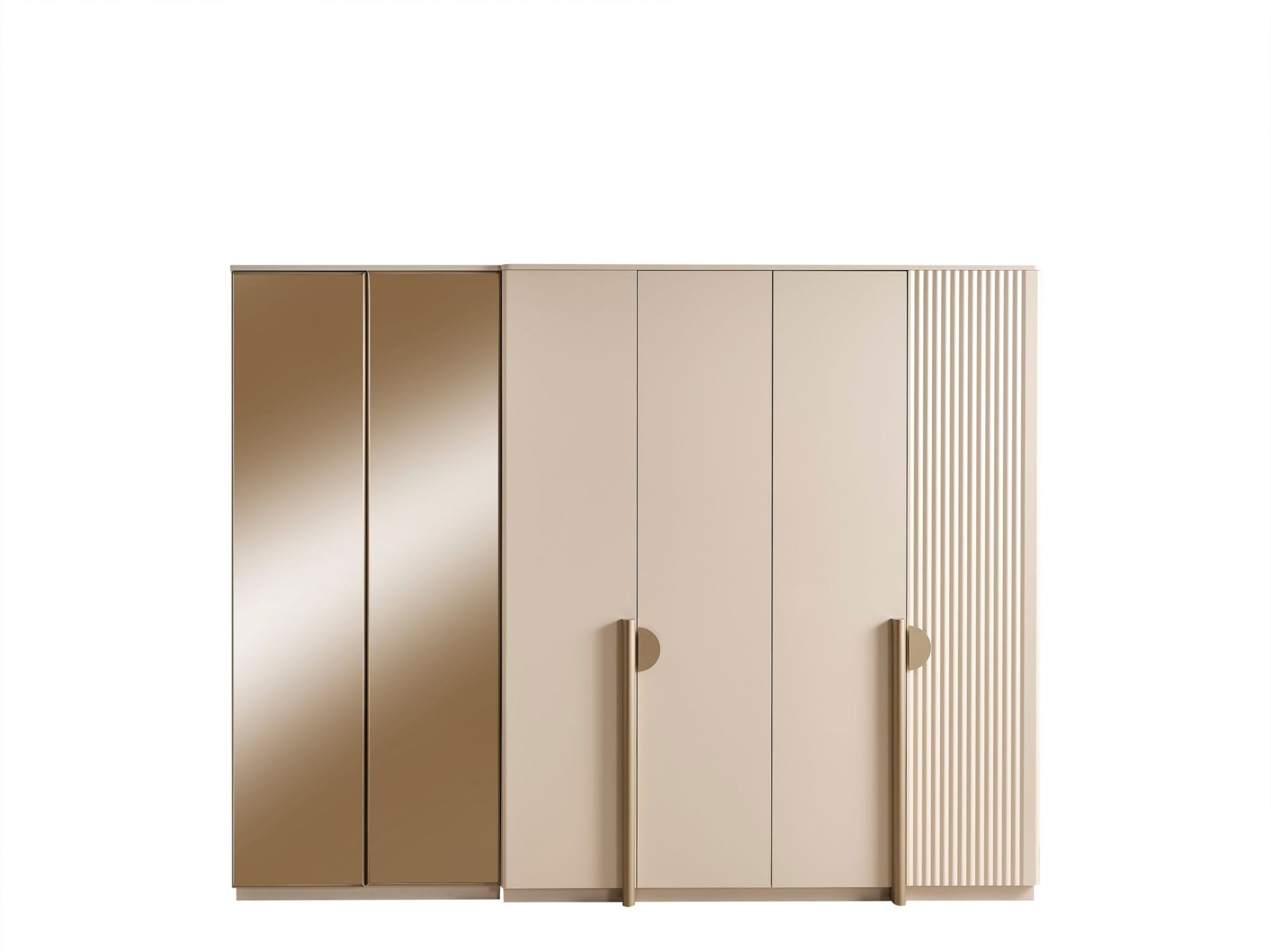 Dolap modüler olarak 4+2 şeklinde imal edilmektedir. Dilerseniz ürünü odanın farklı yerlerine parçalı olarak ta yerleştirebilirsiniz. Ahşap kapaklar ve dış görünür yüzeyler MDF malzemeden imal edilmiştir. Ahşap kapaklar yeni nesil renk kaplama olarak üretilmiştir. Kabarma ve solma görülmez. Yan yüzeyler de aynı renktedir. İkili modül cam kapaklıdır. Aynı şeklide dışarı bakan tarafları da cam çerçeveli olarak imal edilmiştir. İç bölmede raylı çekmeceler ve çok sayıda raflı bölme yer alır .