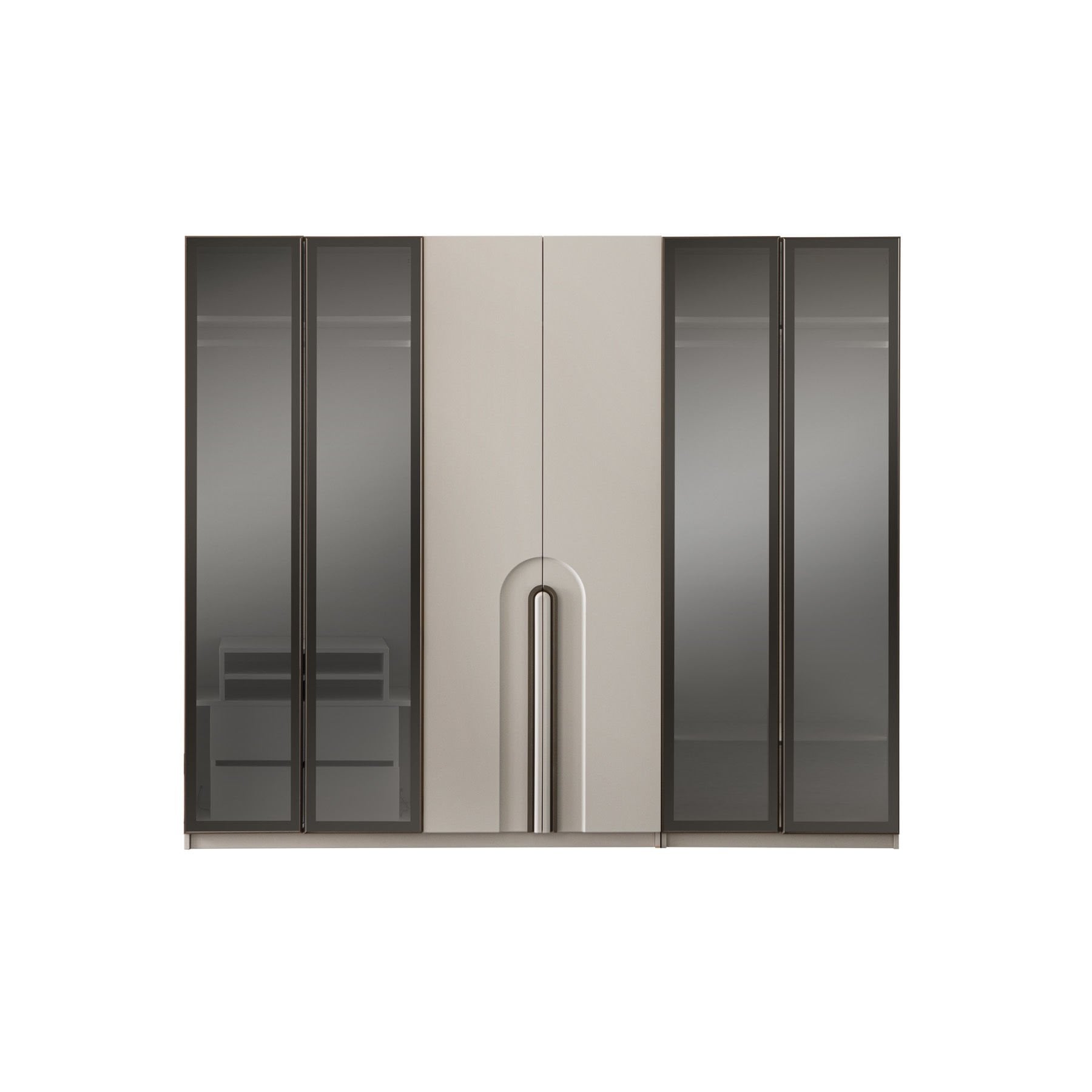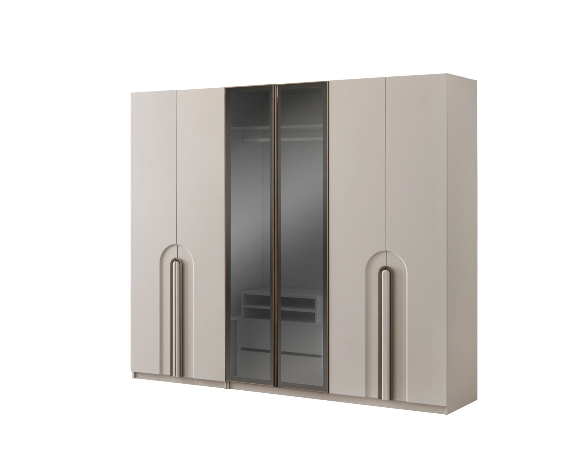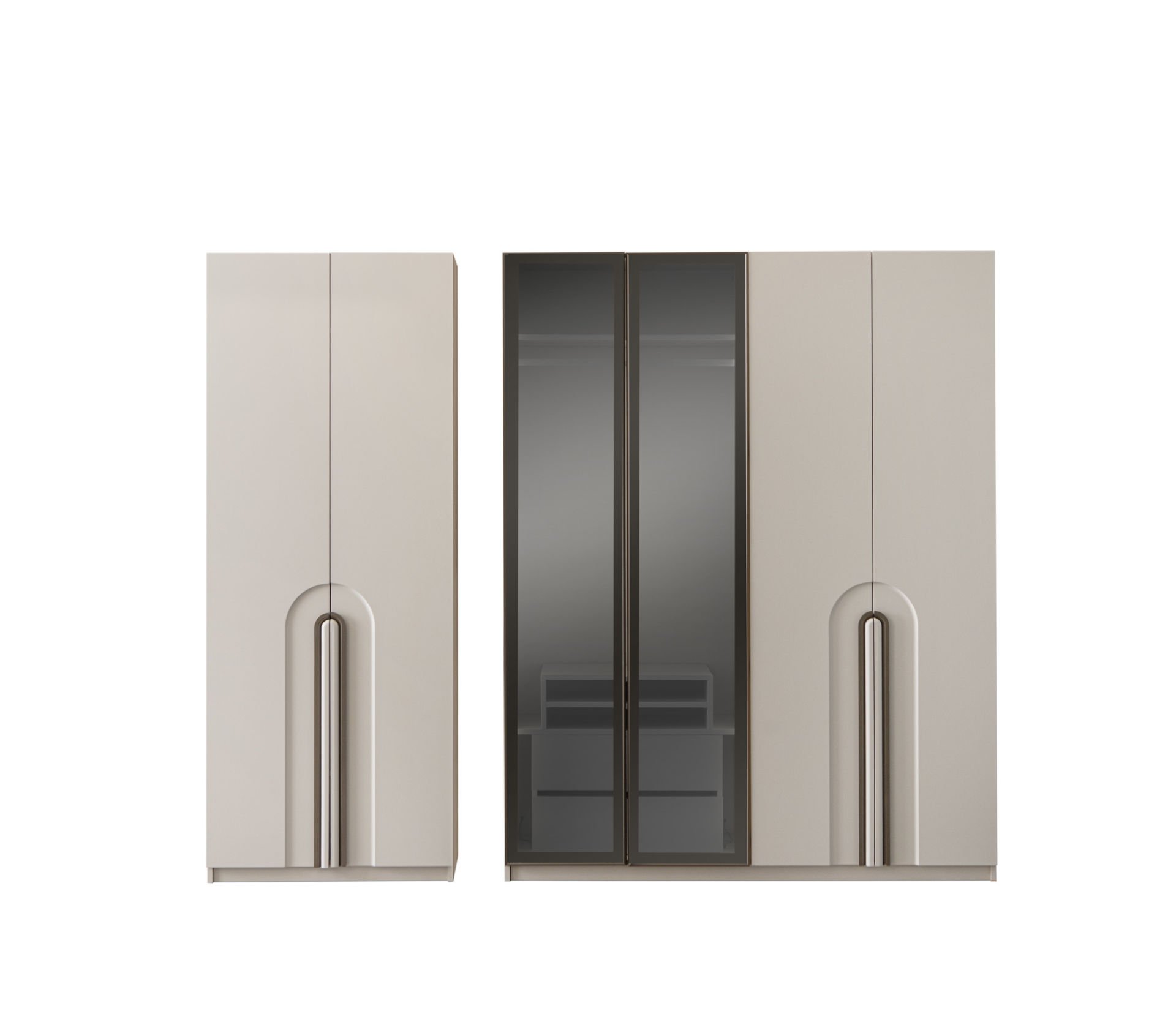 Dolap modüler olarak 4+2 şeklinde imal edilmektedir. Dilerseniz ürünü odanın farklı yerlerine parçalı olarak ta yerleştirebilirsiniz. Ahşap kapaklar ve dış görünür yüzeyler MDF malzemeden imal edilmiştir. Ahşap kapaklar yeni nesil renk kaplama olarak üretilmiştir. Kabarma ve solma görülmez. Yan yüzeyler de aynı renktedir. 4’lü modülün 2 bölmesi cam kapaklıdır. Aynı şeklide dışarı bakan tarafları da cam çerçeveli olarak imal edilmiştir. İç bölmede raylı çekmeceler yer alır. Dilerseniz 4 cam kapak 2 ahşap kapak şeklinde de üretilebilir.