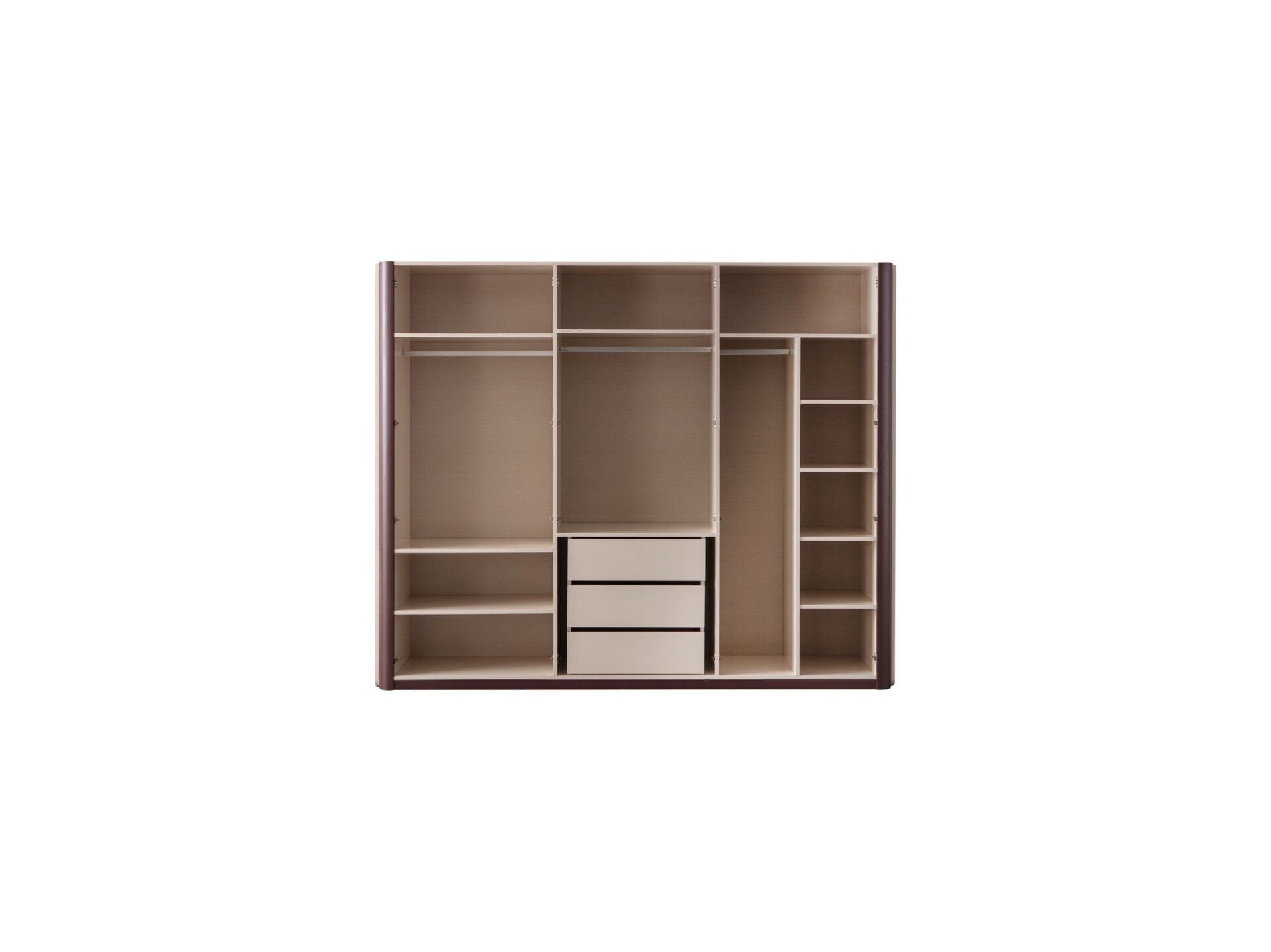 Dolap bir bütün şeklinde imal edilmektedir. Ahşap kapaklar ve dış görünür yüzeyler 1. sınıf suntelam malzemeden imal edilmiştir. Ahşap kapaklar yeni nesil renk kaplama olarak üretilmiştir. Kabarma ve solma görülmez. Yan yüzeyler de aynı renktedir. Orta modüller cam kapaklıdır. Aynı şeklide dışarı bakan tarafları da cam çerçeveli olarak imal edilmiştir. Camlı olan kısımlar aynı zamanda LED aydınlatmalıdır. İç bölmede raylı çekmeceler yer alır. İsteğe göre dolabın tüm kapakları camlı olarak üretiledebilir.