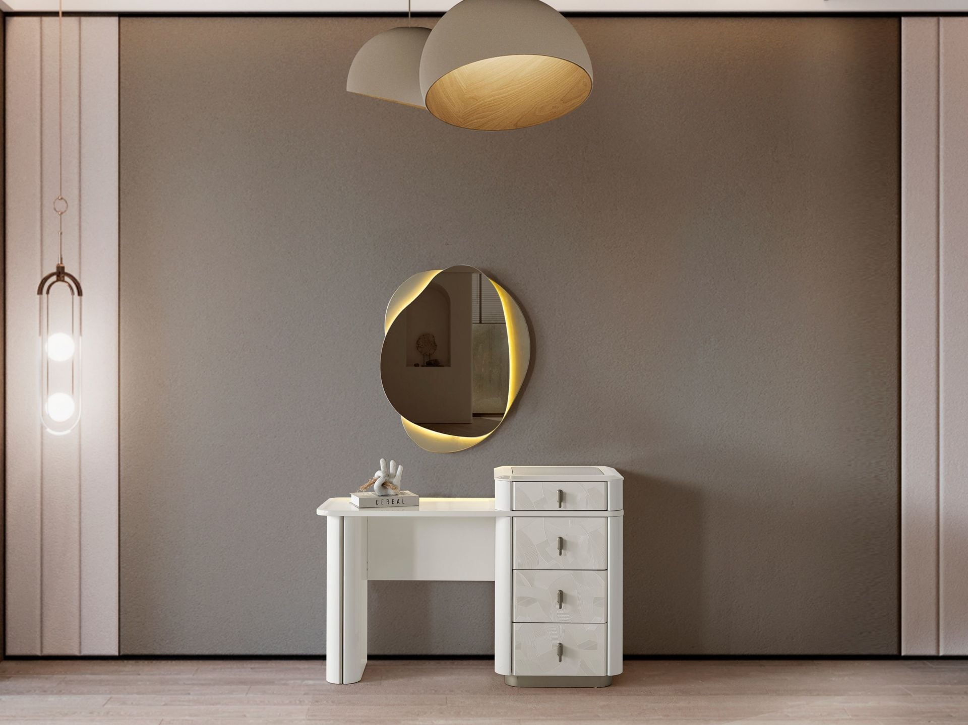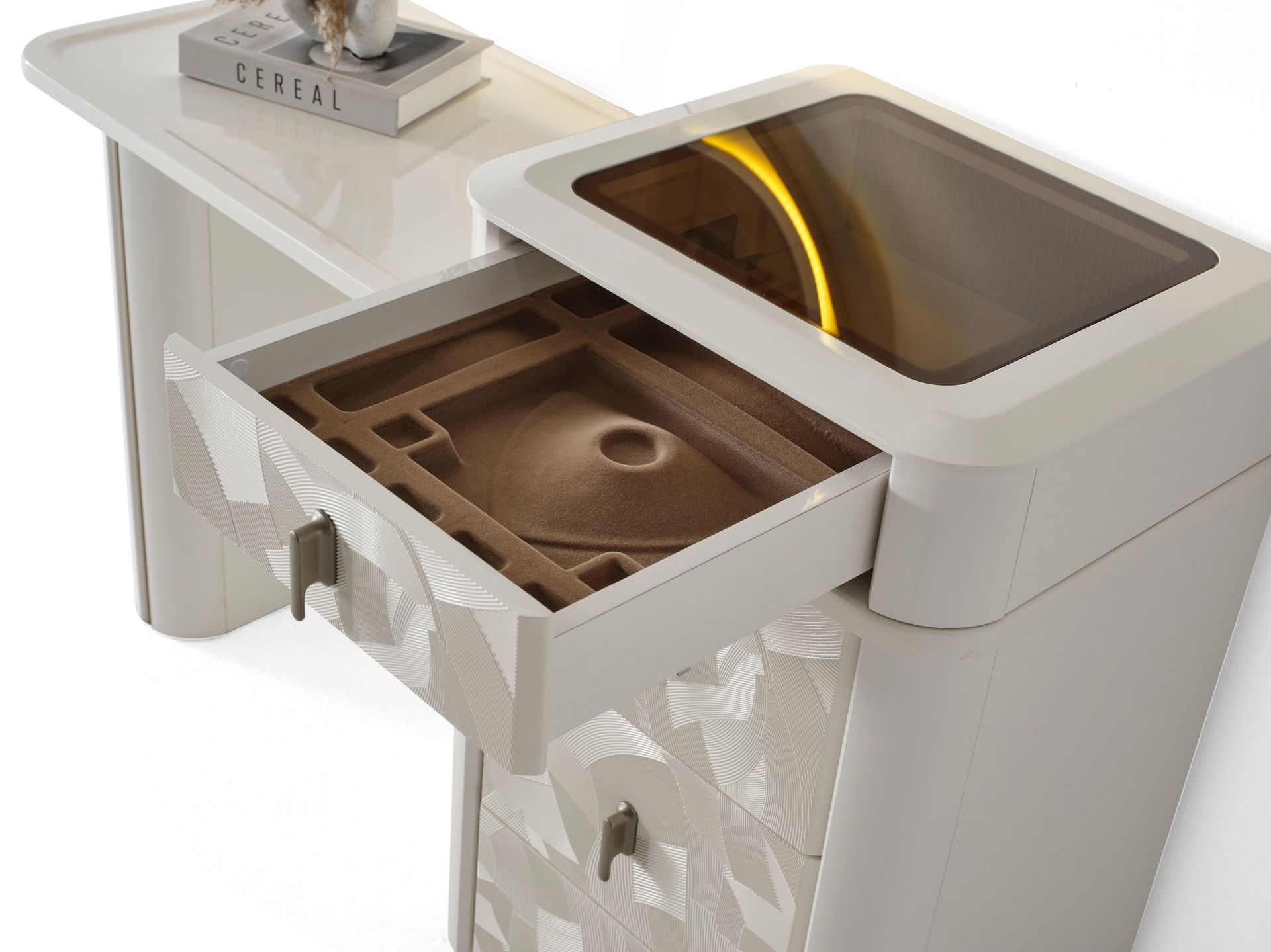 Şifonyer üst tablası camdır. Bu camlı bölme ziynet çekmecesinin teşhiri olarak tasarlanmıştır. 4 adet çekmeceye sahiptir. Çekmeceler ray ve yavaşlatıcı kullanılarak imal edilmiştir. Dekoratif ayna LED aydınlatmalıdır. Mukavemete ve çizilmeye dayanıklıdır. Ayaklar ahşap malzemedir.