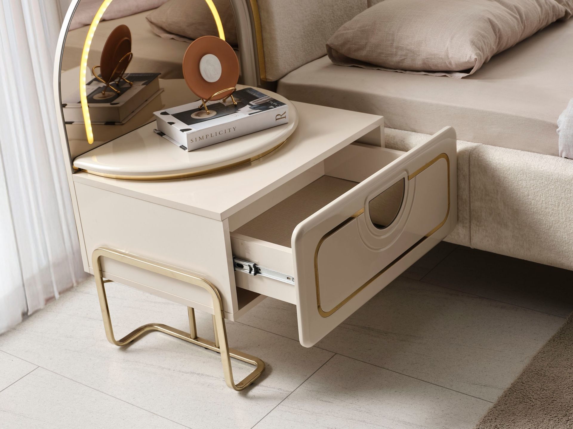 Komodinlerin dış yüzeyleri MDF malzemedir. 1 adet çekmeceye sahiptir. Komodinler metal ayaklı olarak imal edilirler.