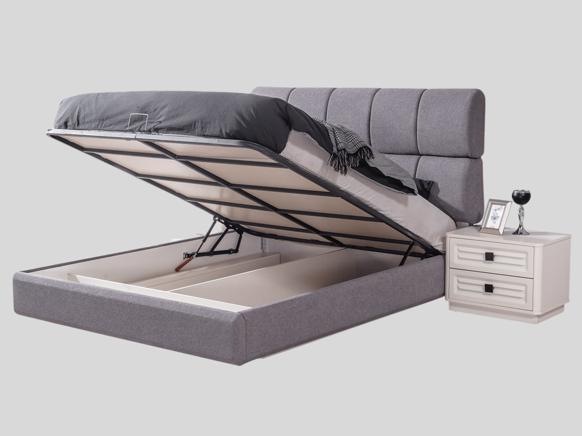 Ürün başlıklı bazalı karyola biçimindedir. Başlık ve karyola çerçevesi kumaş kaplıdır. Başlık tarafı sünger dolguludur. Başlık ve karyola çerçevesi yonga-levha malzemedir. Baza fonksiyonel olarak bölümlendirilmiştir. |