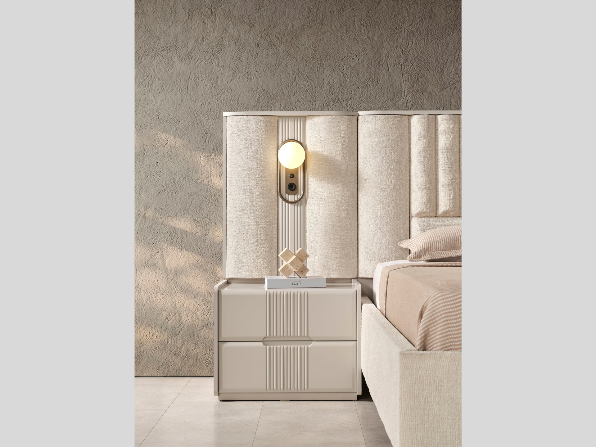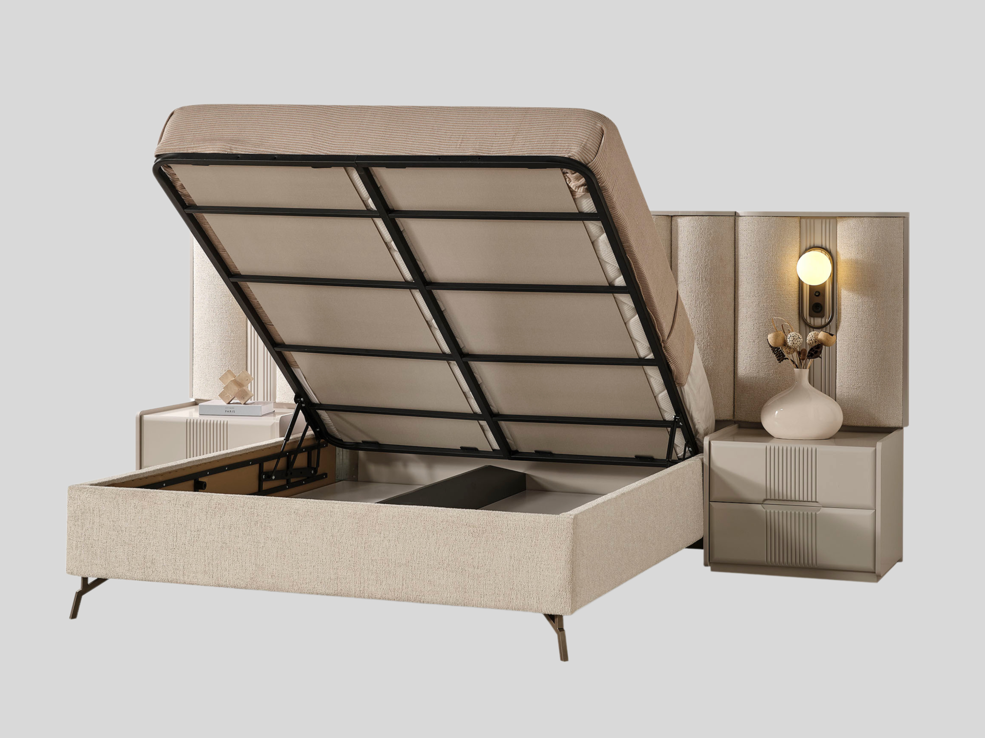 Ürün başlıklı bazalı karyola biçimindedir. Başlık kumaş kaplıdır. Başlık çerçevesi MDF malzemedir. Baza fonksiyonel olarak bölümlendirilmiştir. Başlık çerçevesine dahil edilmiş dekoratif anahtarlı gece lambaları mevcuttur. Gece lambaları altında telefon şarjı ya da okuma lambası için güç kaynağı olarak kullanabileceğiniz her iki tarafında birer adet olmak üzere Type A ve Type C soketleri yer alır.