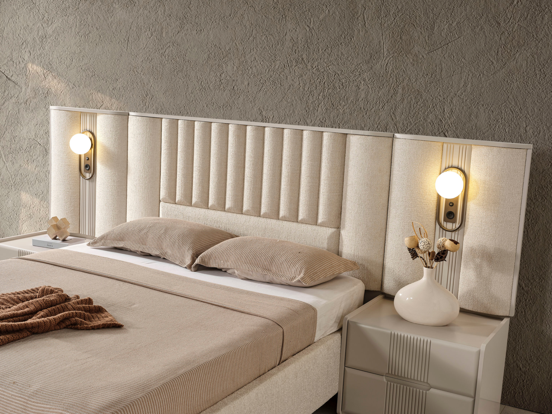 Başlık ve karyola çerçevesi kolay silinebilir, keten karışım kumaşla bezenmiştir.