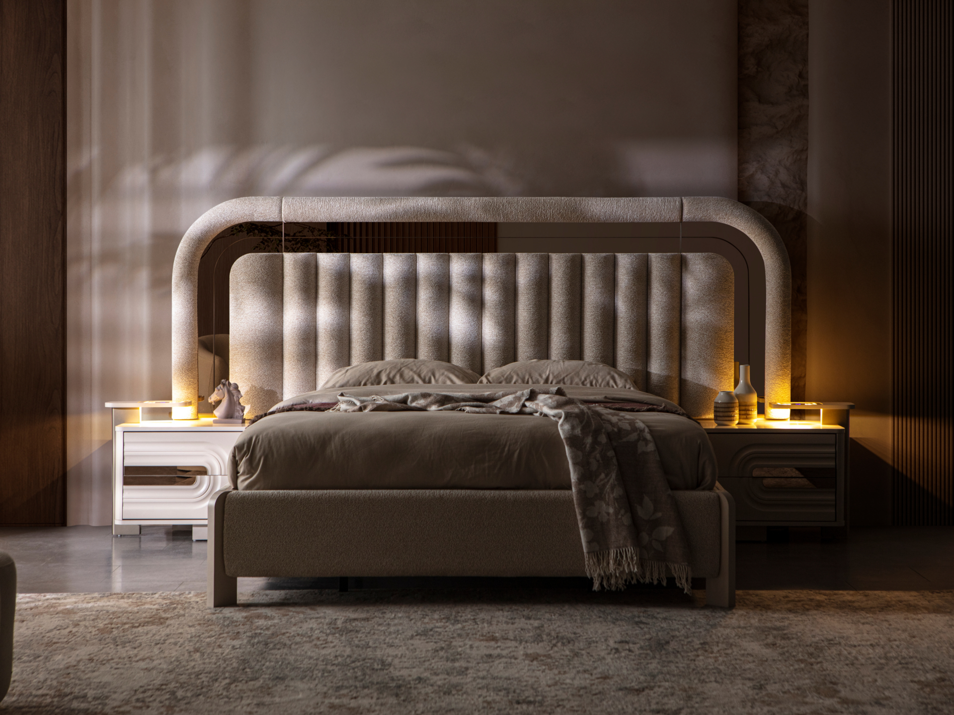 Ürün başlıklı bazalı karyola biçimindedir. Başlık ve karyola çerçevesi ince sünger üzeri kumaş kaplamadır. Baza fonksiyonel olarak bölümlendirilmiştir. Başlık çerçevesi gold renk cam sibularla dekore edilmiştir. Komodinler başlığa entegre edilecek ölçülerde yekpare görünecek şekilde üretilmiştir. |