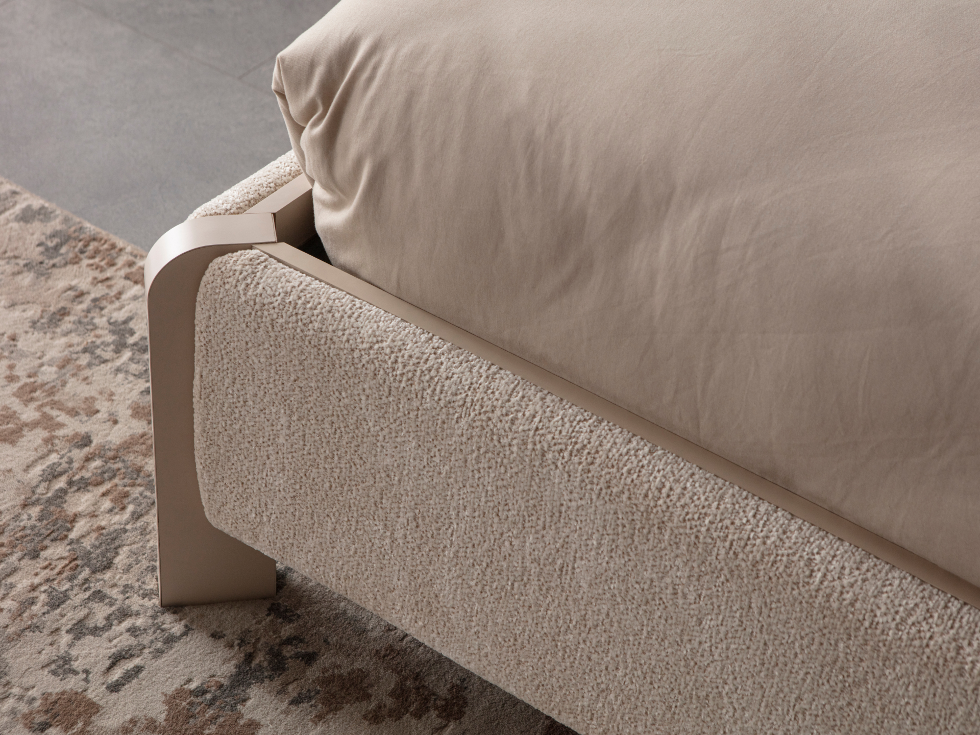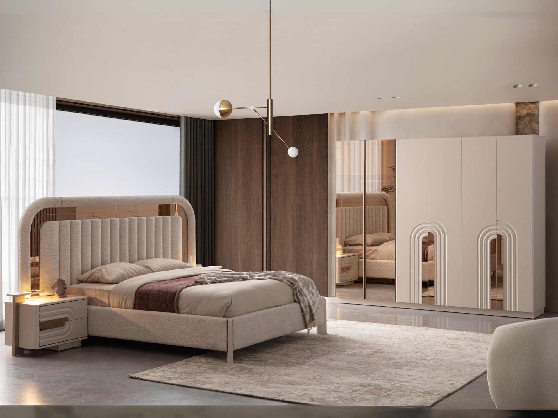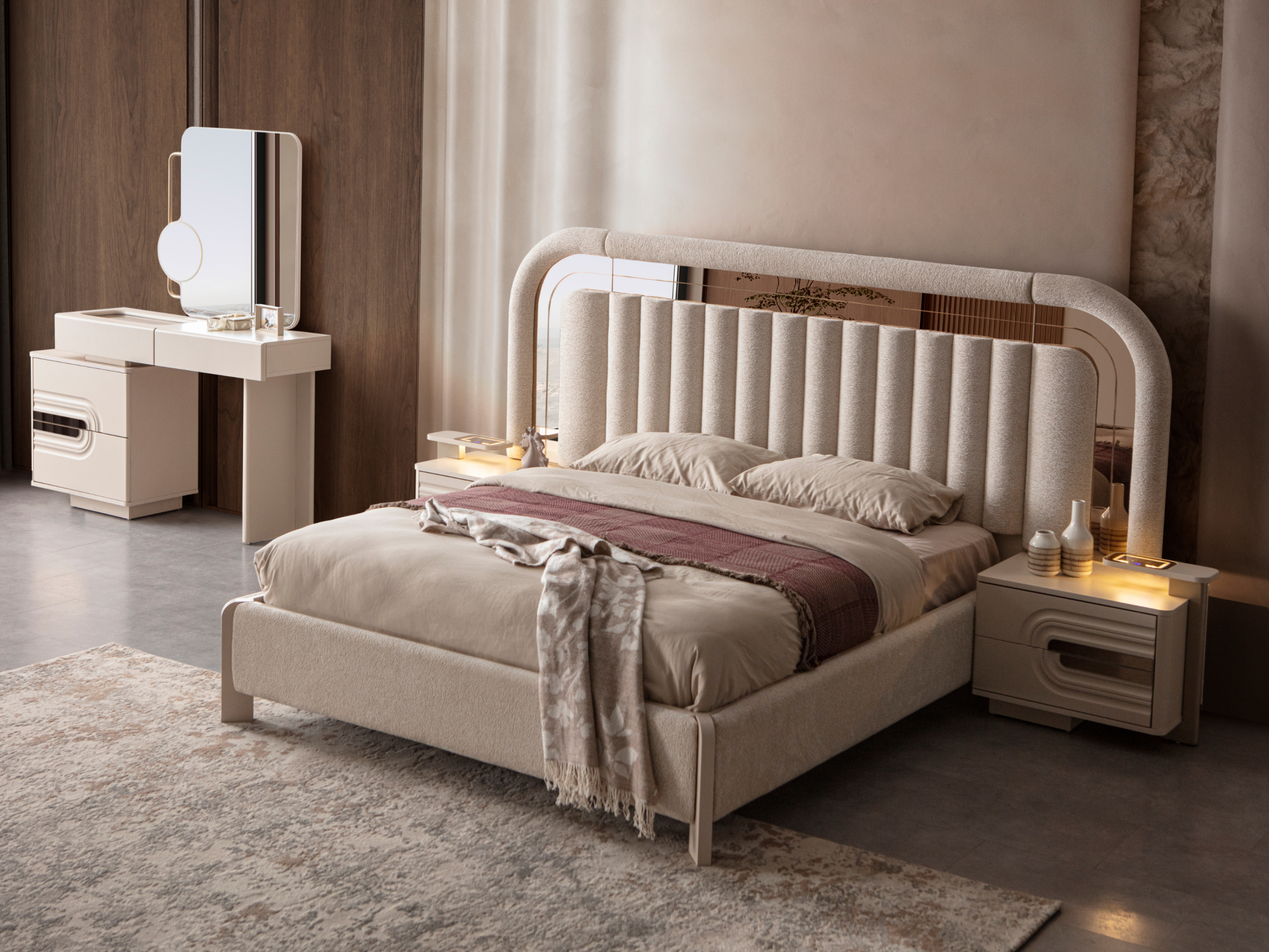 Ürün başlıklı bazalı karyola biçimindedir. Başlık ve karyola çerçevesi ince sünger üzeri kumaş kaplamadır. Baza fonksiyonel olarak bölümlendirilmiştir. Başlık çerçevesi gold renk cam sibularla dekore edilmiştir. Komodinler başlığa entegre edilecek ölçülerde yekpare görünecek şekilde üretilmiştir.