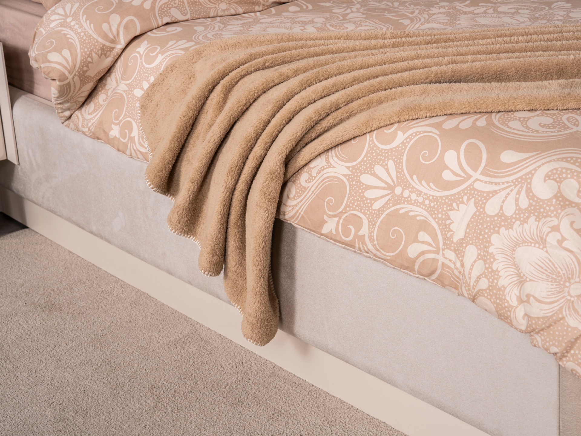 Başlık ve karyola çerçevesi ince sünger üzeri kolay silinebilir, pamuklu, dokuma, tüysüz kadife kumaşla bezenmiştir. |