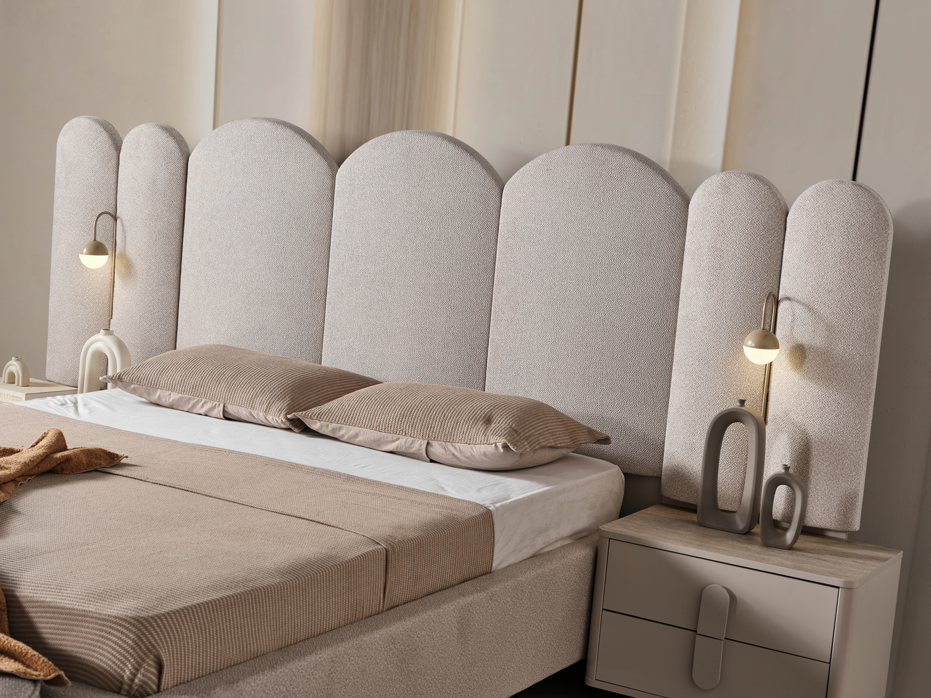 Başlık ve karyola çerçevesi ince sünger üzeri kolay silinebilir, pamuklu, dokuma şönil kumaşla bezenmiştir.