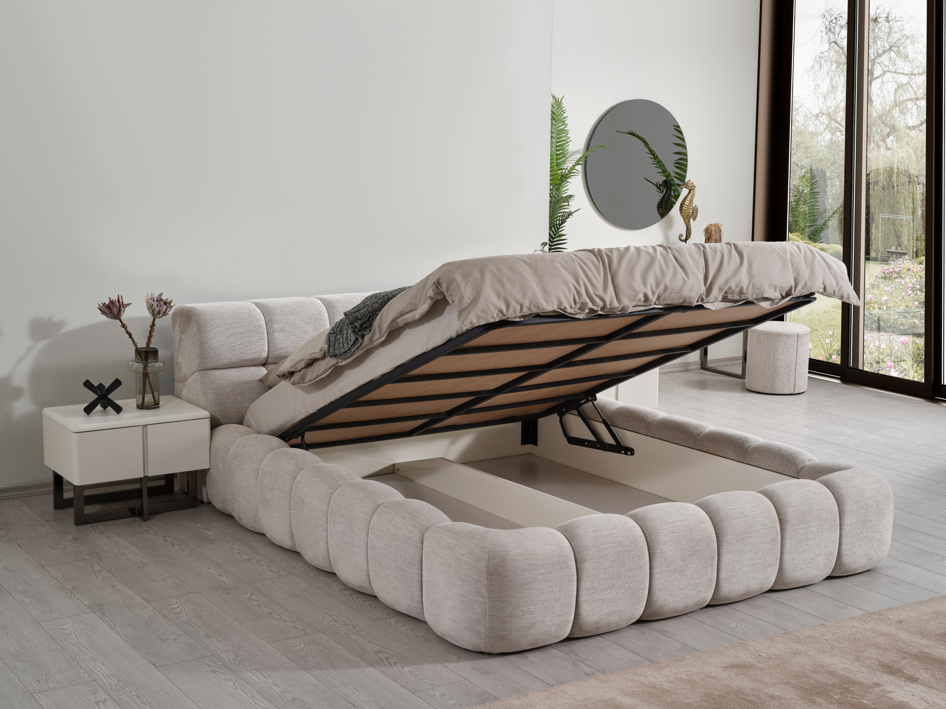 Başlık ve karyola çerçevesi kolay silinebilir antibakteriyel pamuklu, keten karışım, yumuşak şönil kumaşla bezenmiştir.