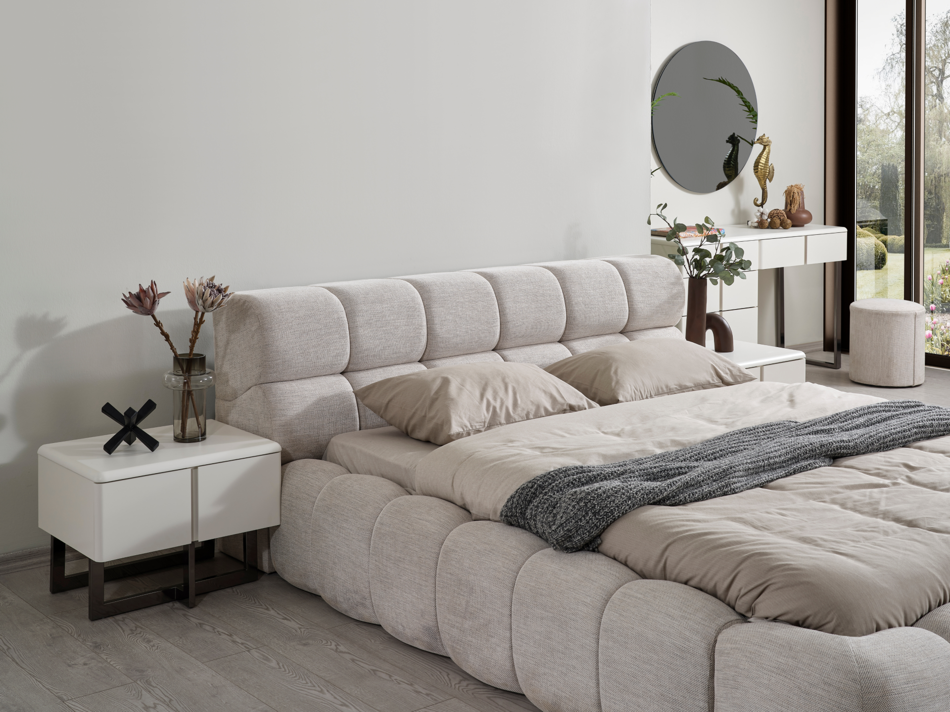Başlık ve karyola çerçevesi kolay silinebilir antibakteriyel pamuklu, keten karışım, yumuşak şönil kumaşla bezenmiştir. |