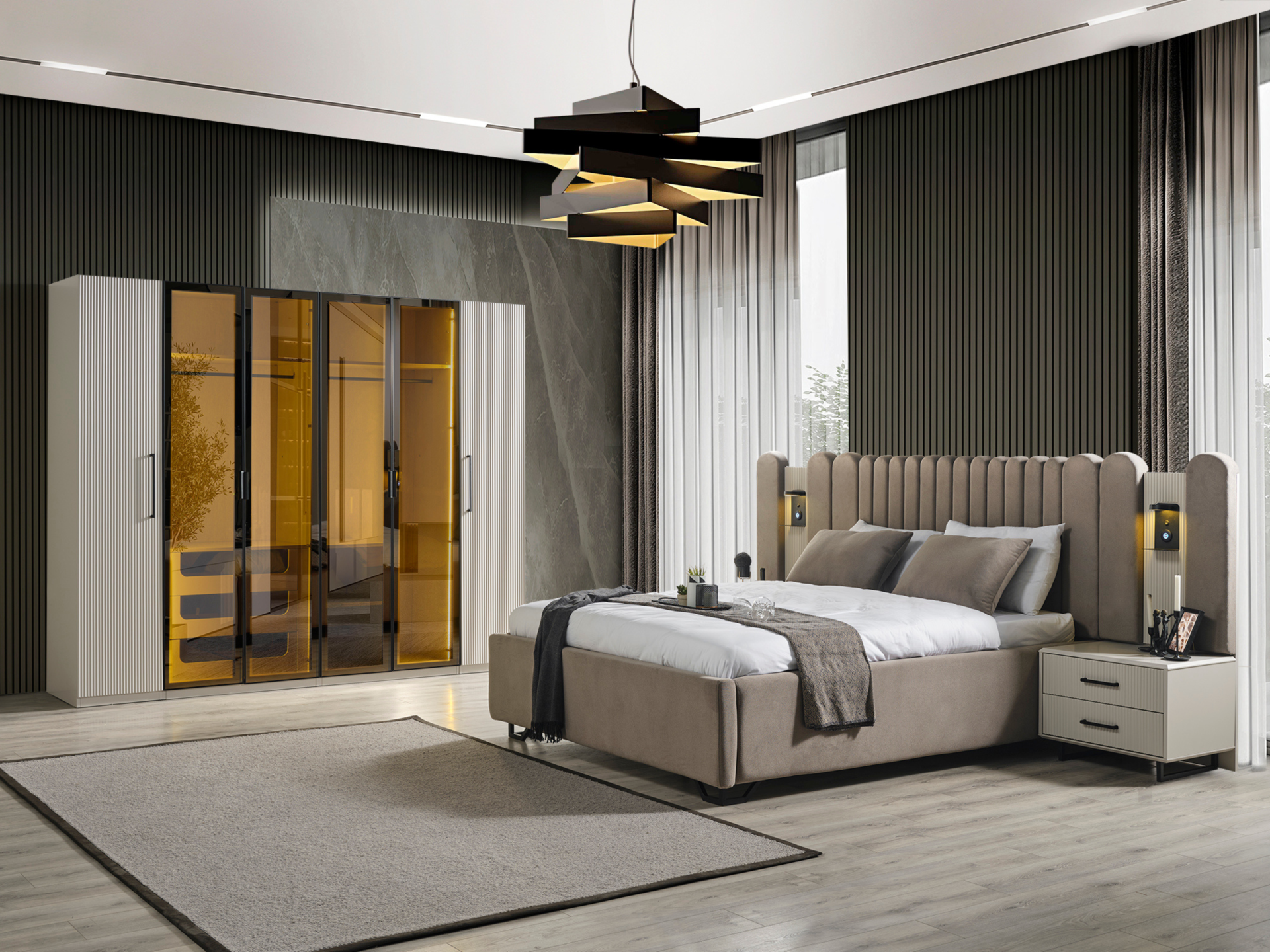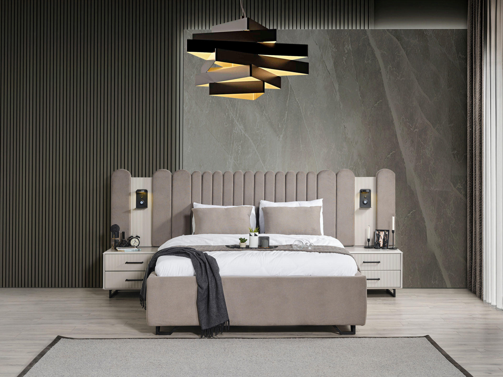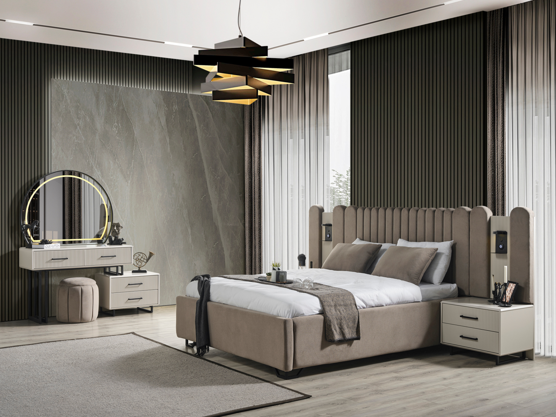 Ürün başlıklı bazalı karyola biçimindedir. Başlık ve karyola çerçevesi sünger üzeri kumaş kaplamadır. Baza fonksiyonel olarak bölümlendirilmiştir. |