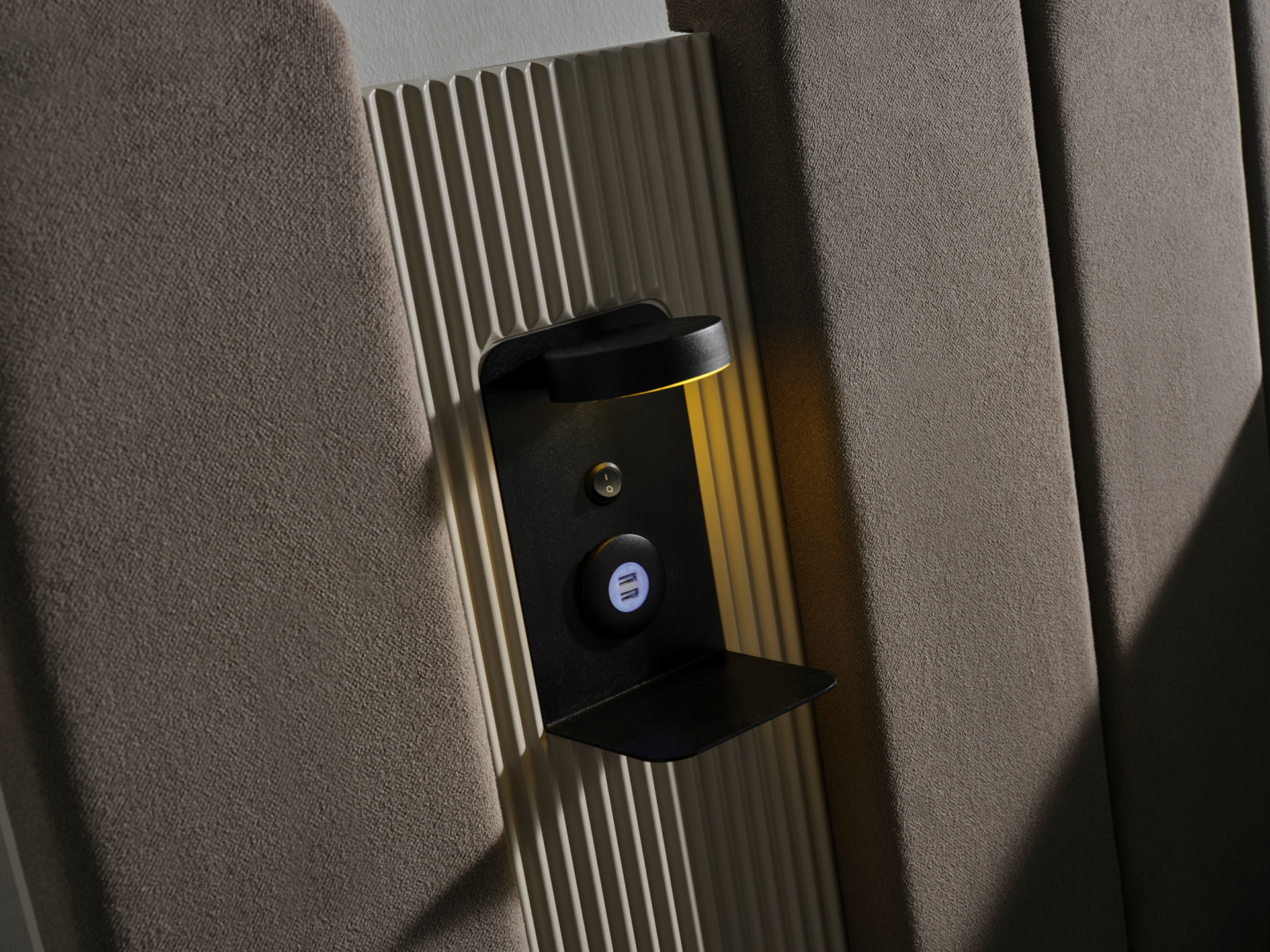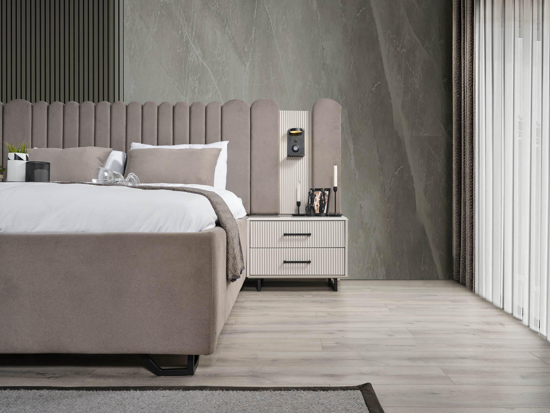 Başlık ve karyola çerçevesi kolay silinebilir antibakteriyel keten karışım şönil kumaşla bezenmiştir.