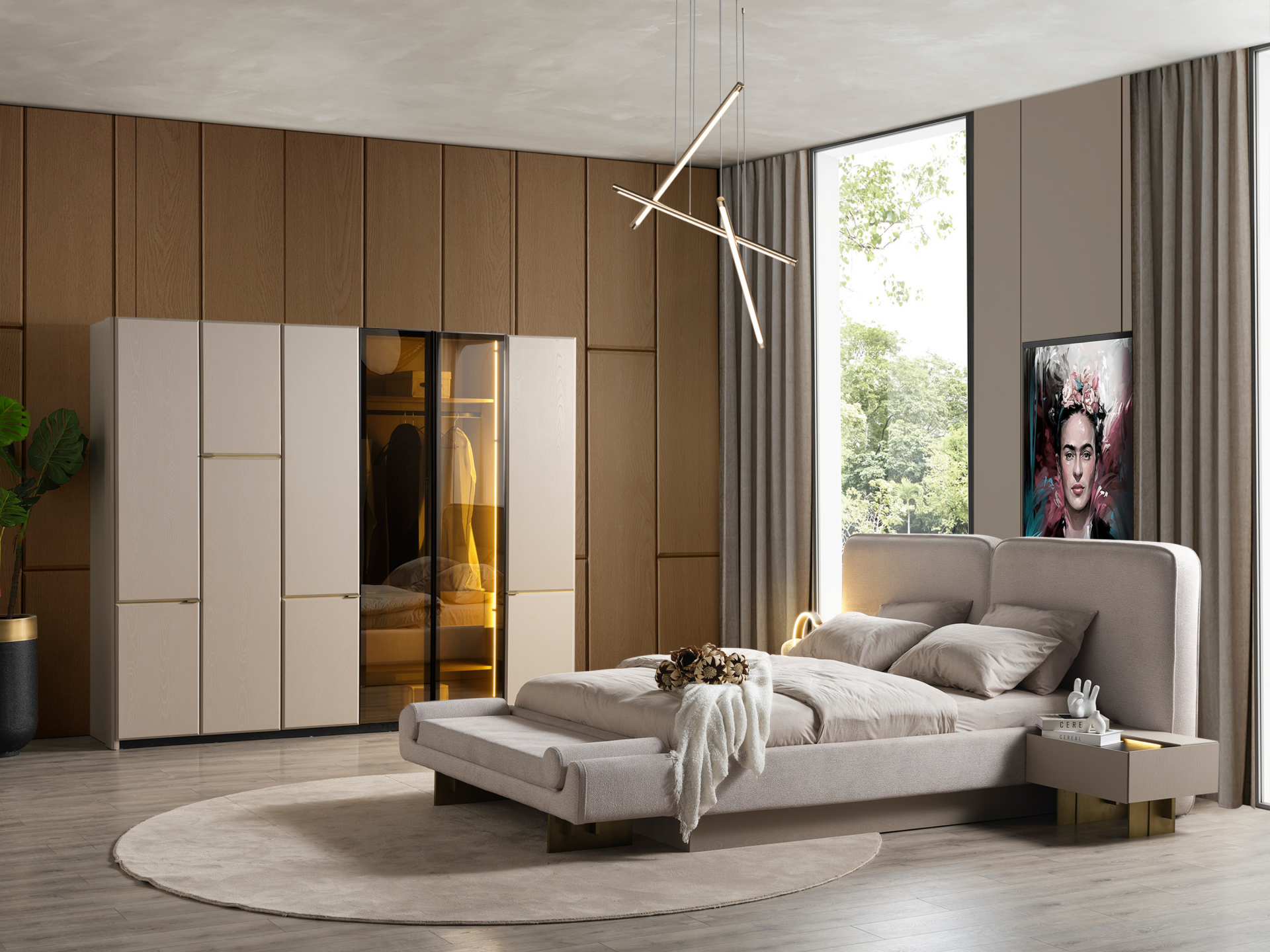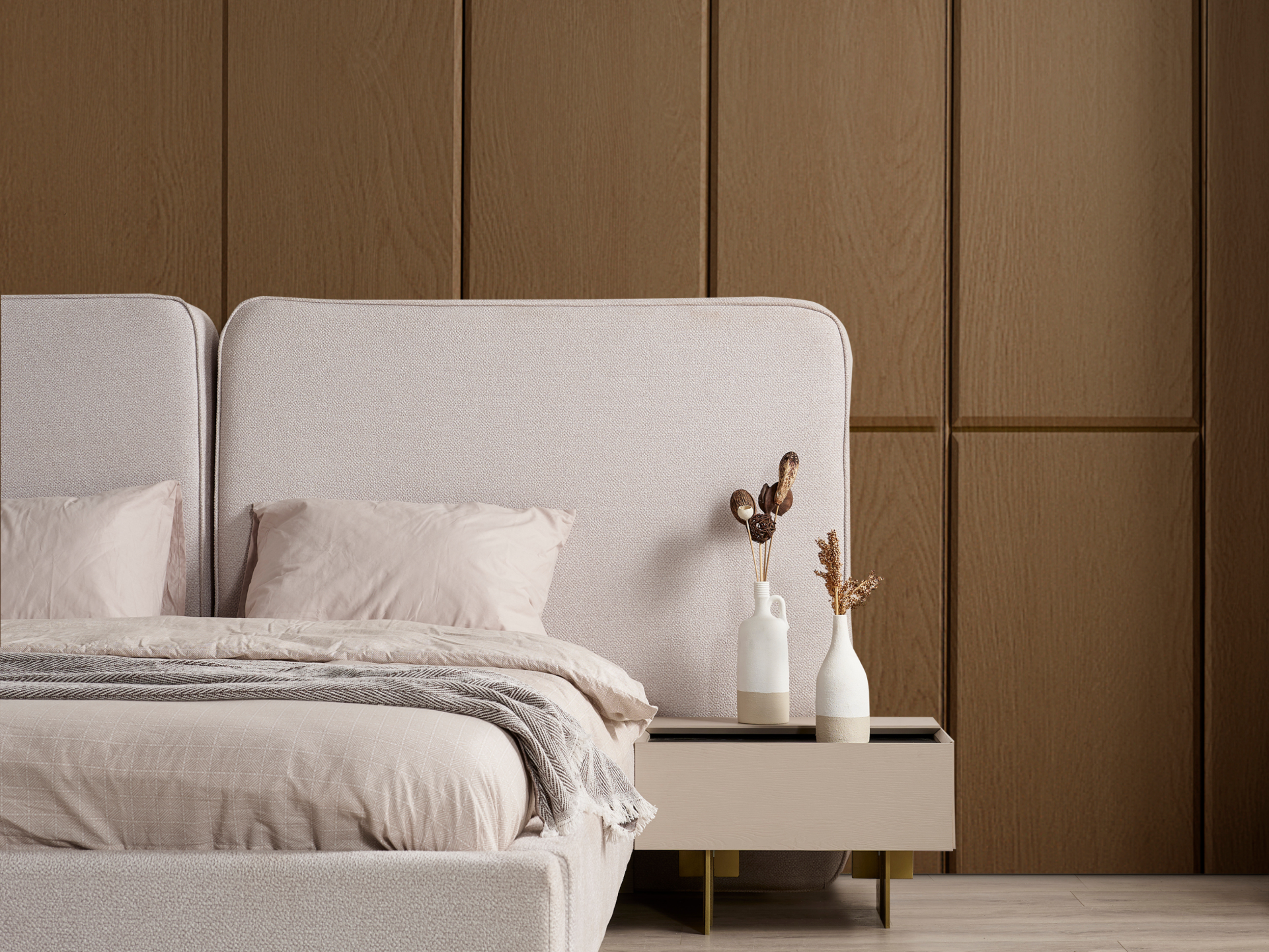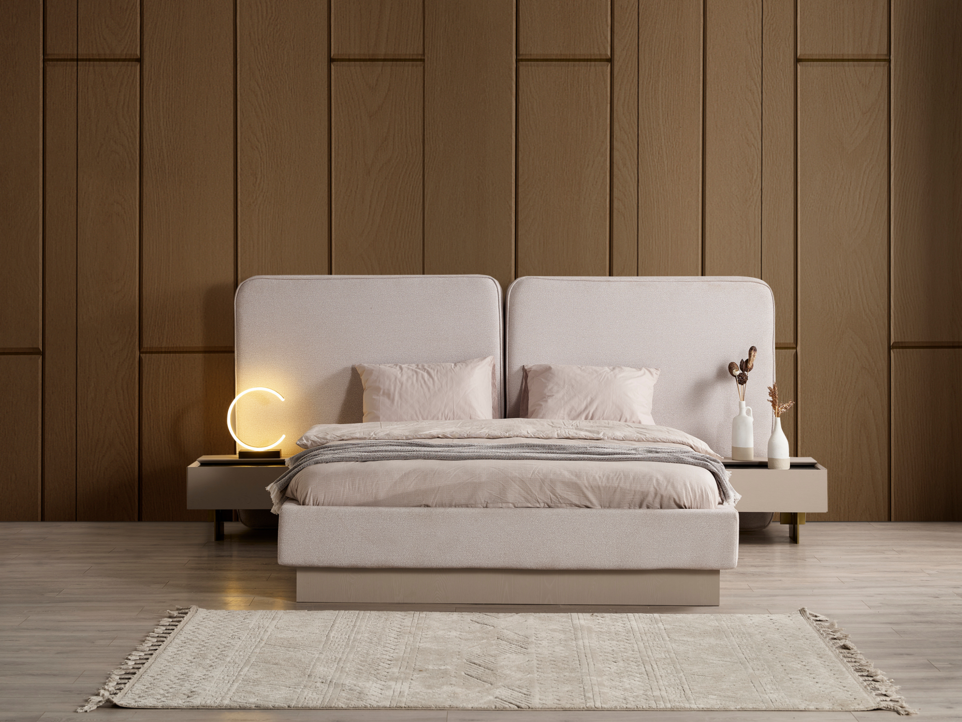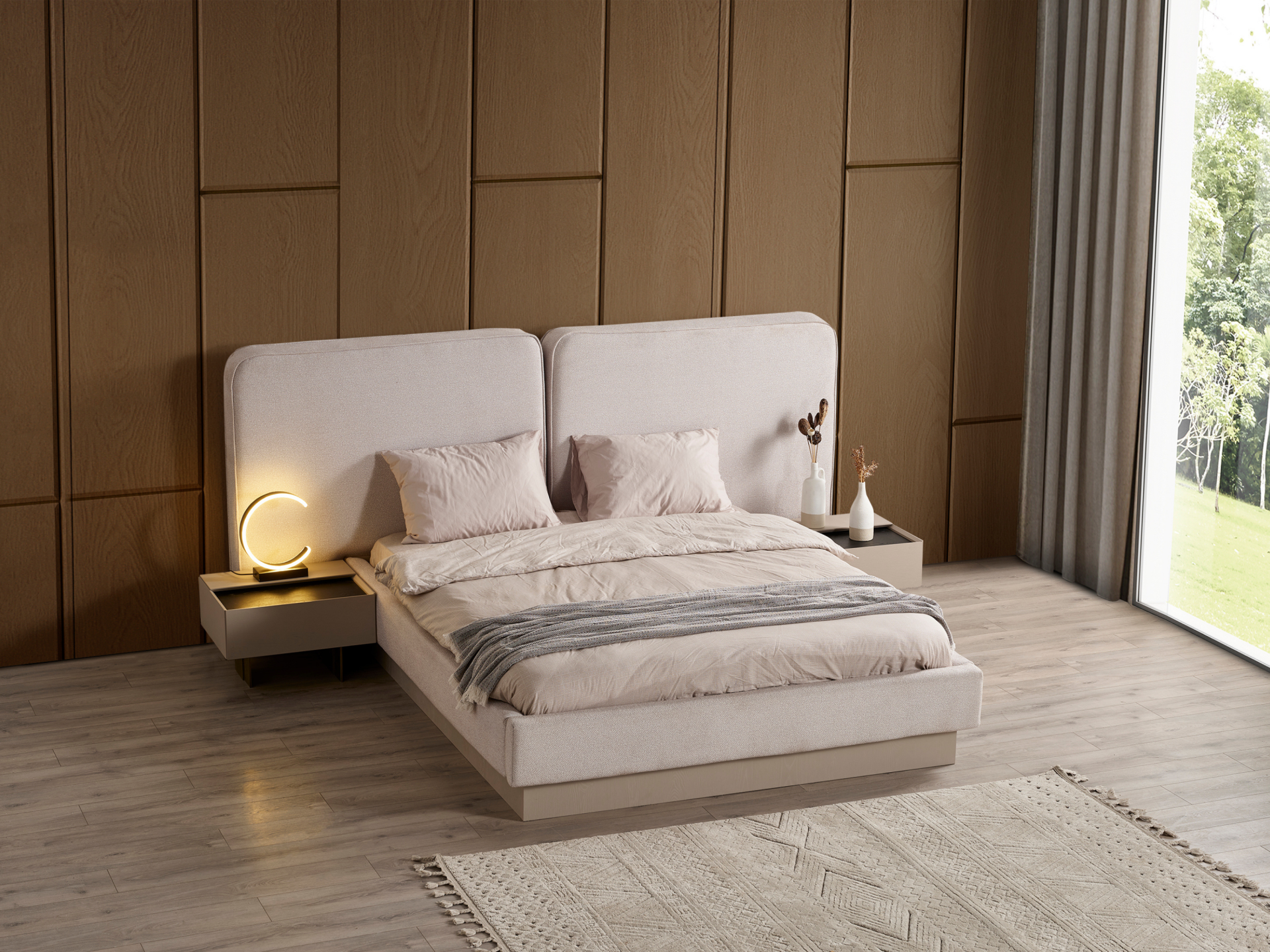 Başlık ve karyola çerçevesi kolay silinebilir antibakteriyel keten karışım şönil kumaşla bezenmiştir.