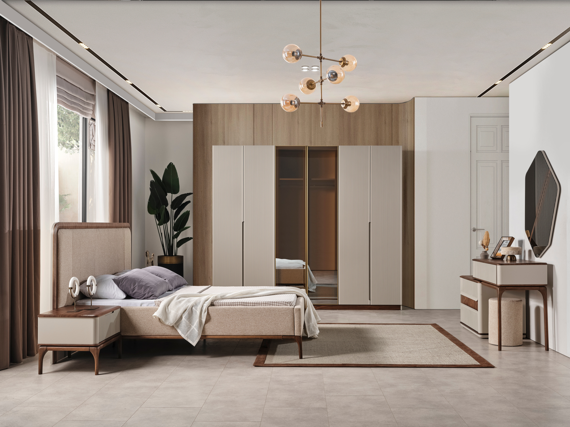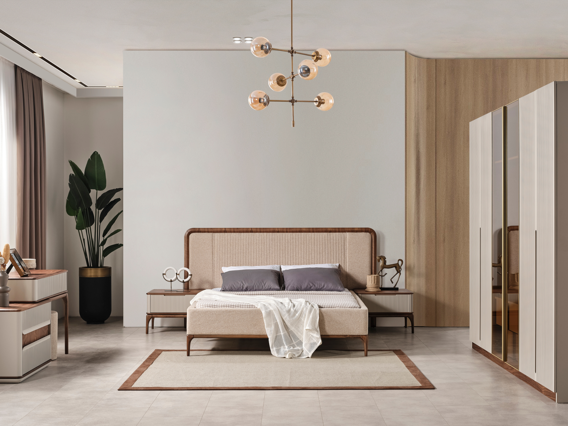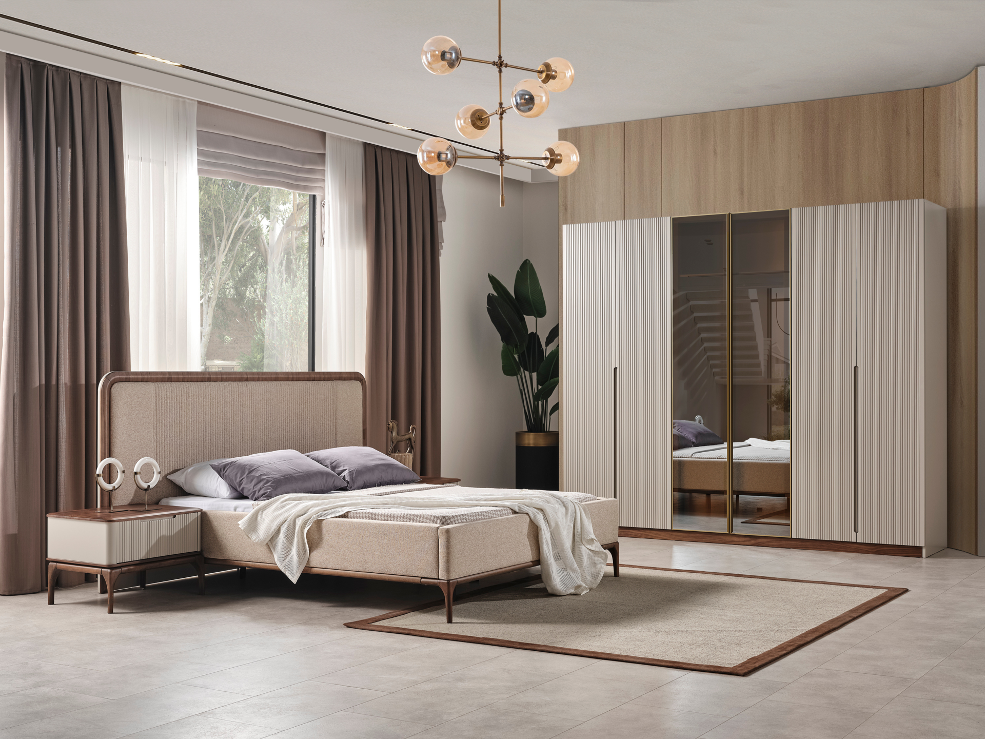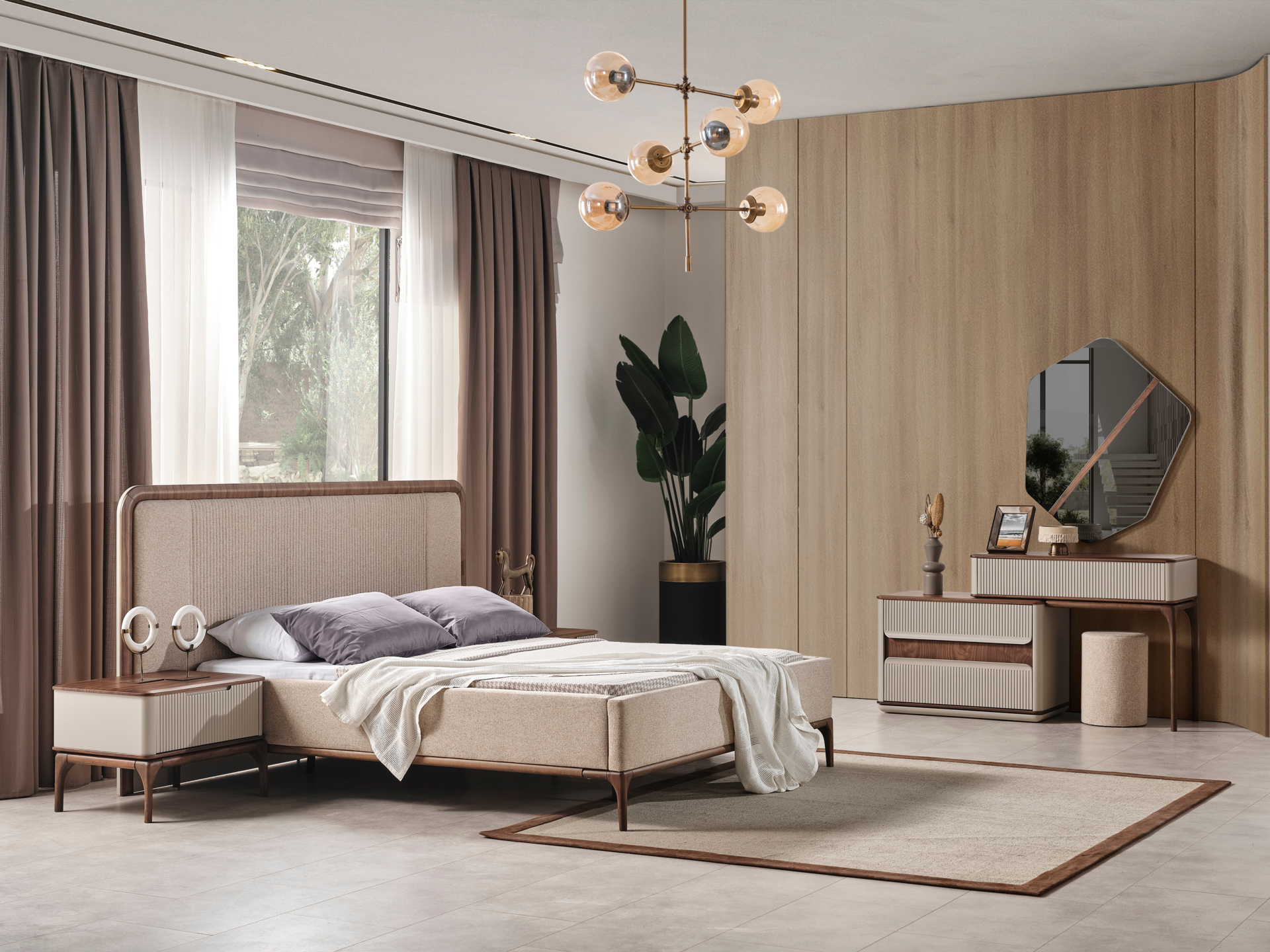 Ürün başlıklı bazalı karyola biçimindedir. Başlık ve karyola çerçevesi ince sünger üzeri kumaş kaplamadır. Baza fonksiyonel olarak bölümlendirilmiştir. Ürün dekorları MDF ve kayın ağacı oyularak yapılmıştır.