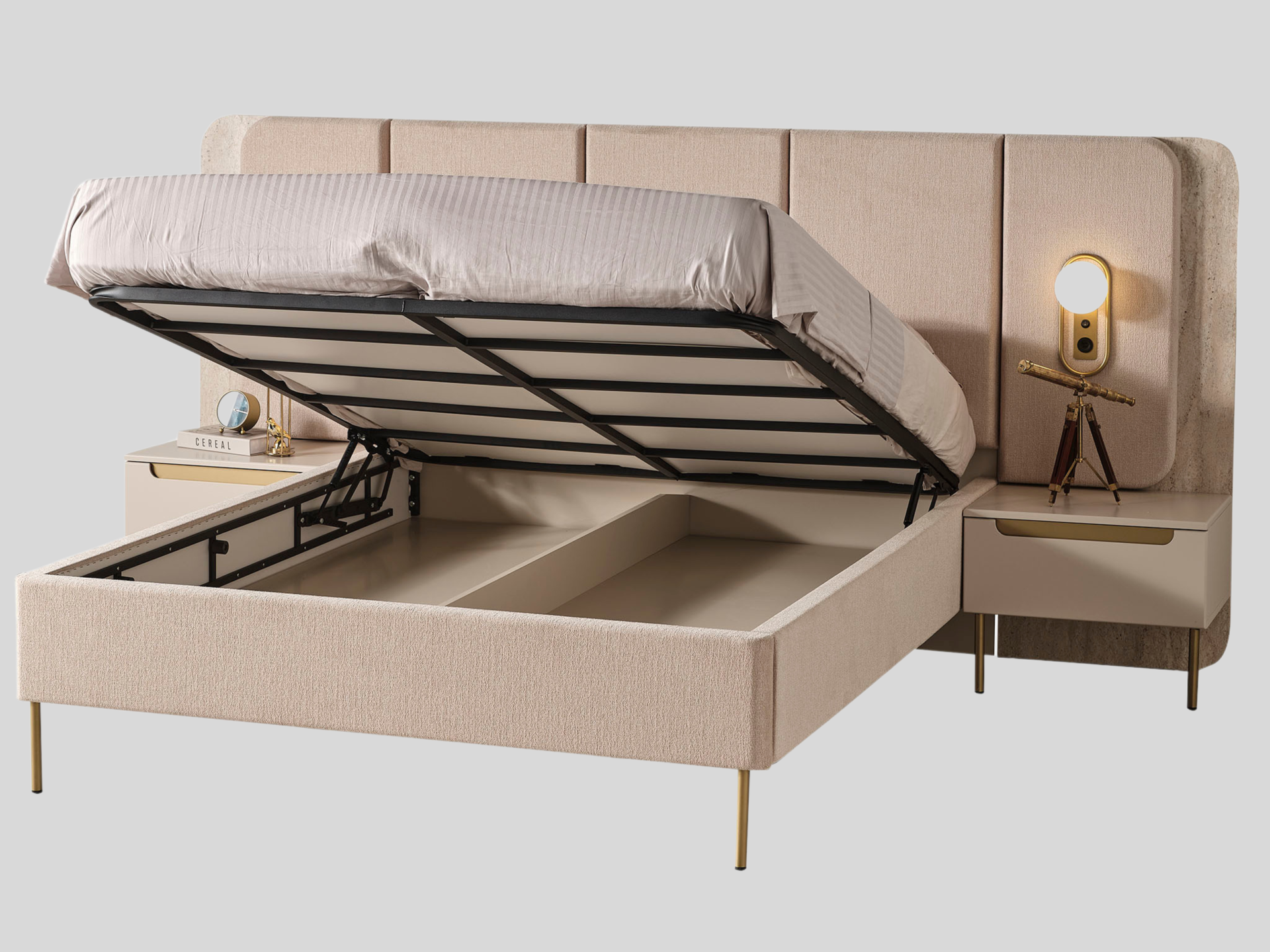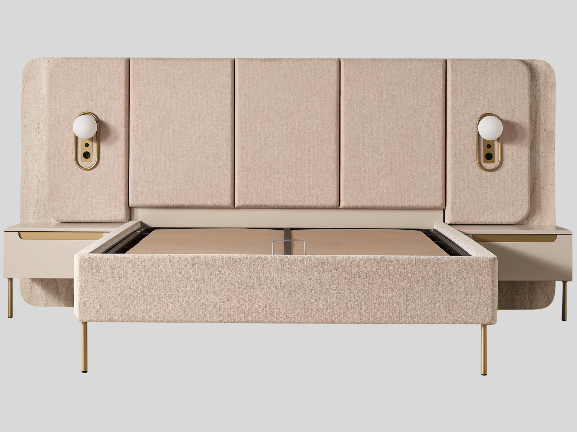 Ürün başlıklı bazalı karyola biçimindedir. Başlık ve karyola çerçevesi ince sünger üzeri kumaş kaplamadır. Karyola başlığı, panolu ve gece lambalı komodinlere entegre yapılabilir şeklide üretilmiştir. |