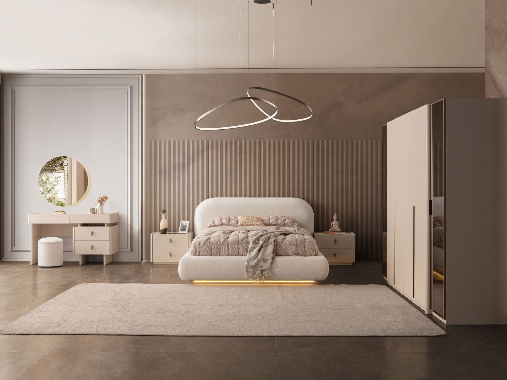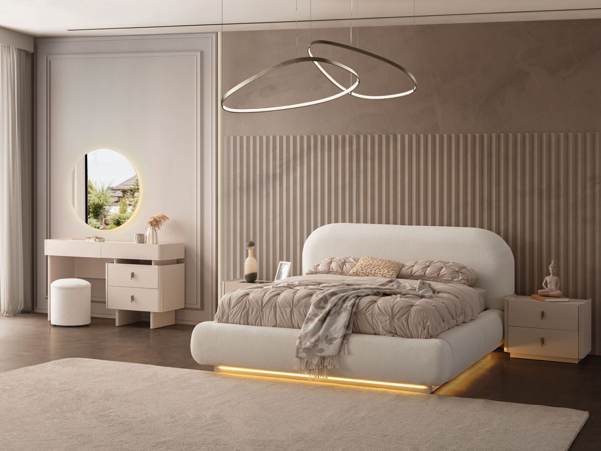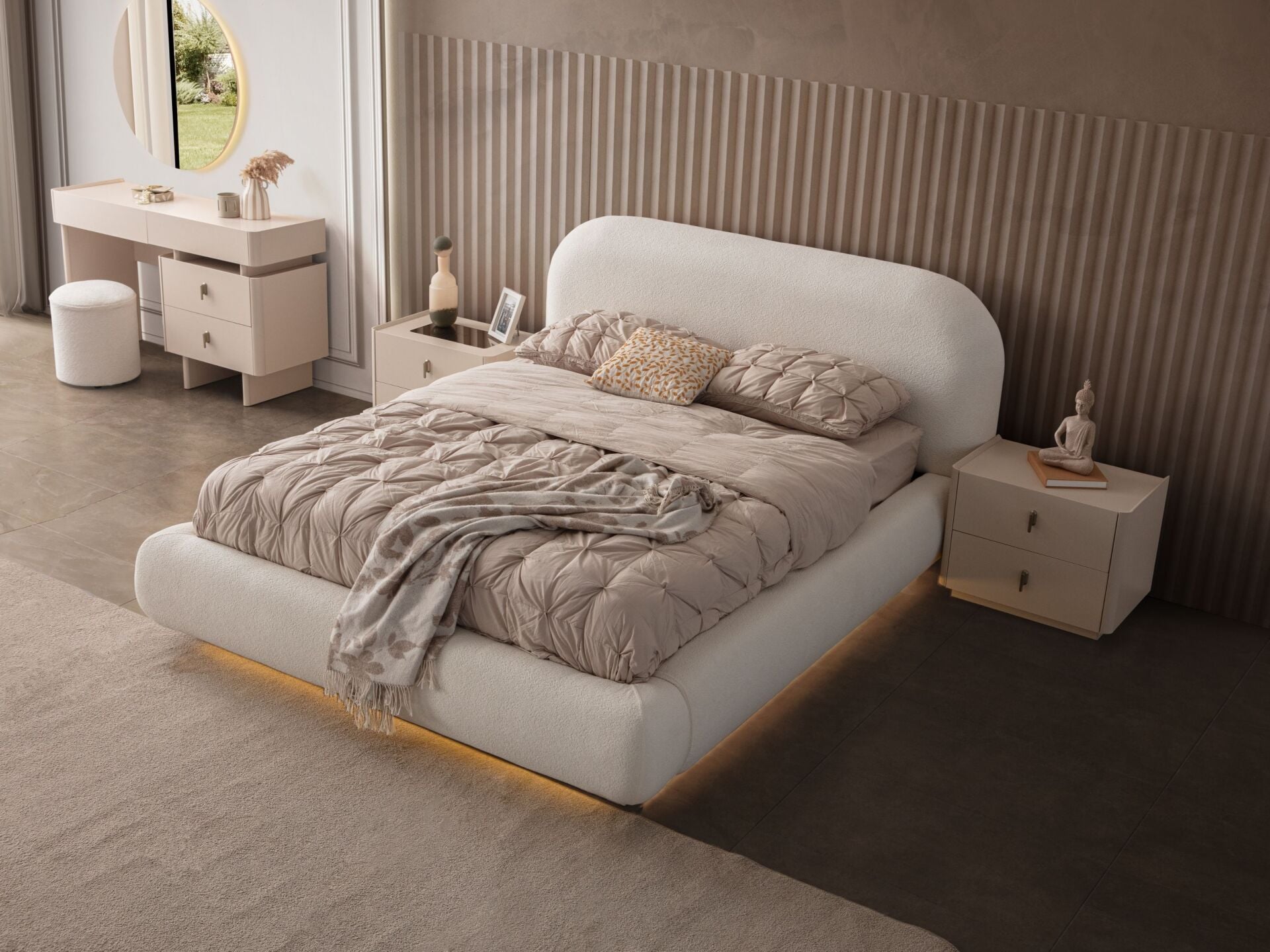 Ürün başlıklı bazalı karyola biçimindedir. Başlık ve karyola çerçevesi sünger üzeri kumaş kaplıdır. Başlık ve karyola çerçevesi yonga-levha malzemedir. Karyola altı LED ambiyans aydınlatmalıdır. Gece lambasına lüzum bırakmayacak aydınlığa sahiptir. Baza fonksiyonel olarak bölümlendirilmiştir.
