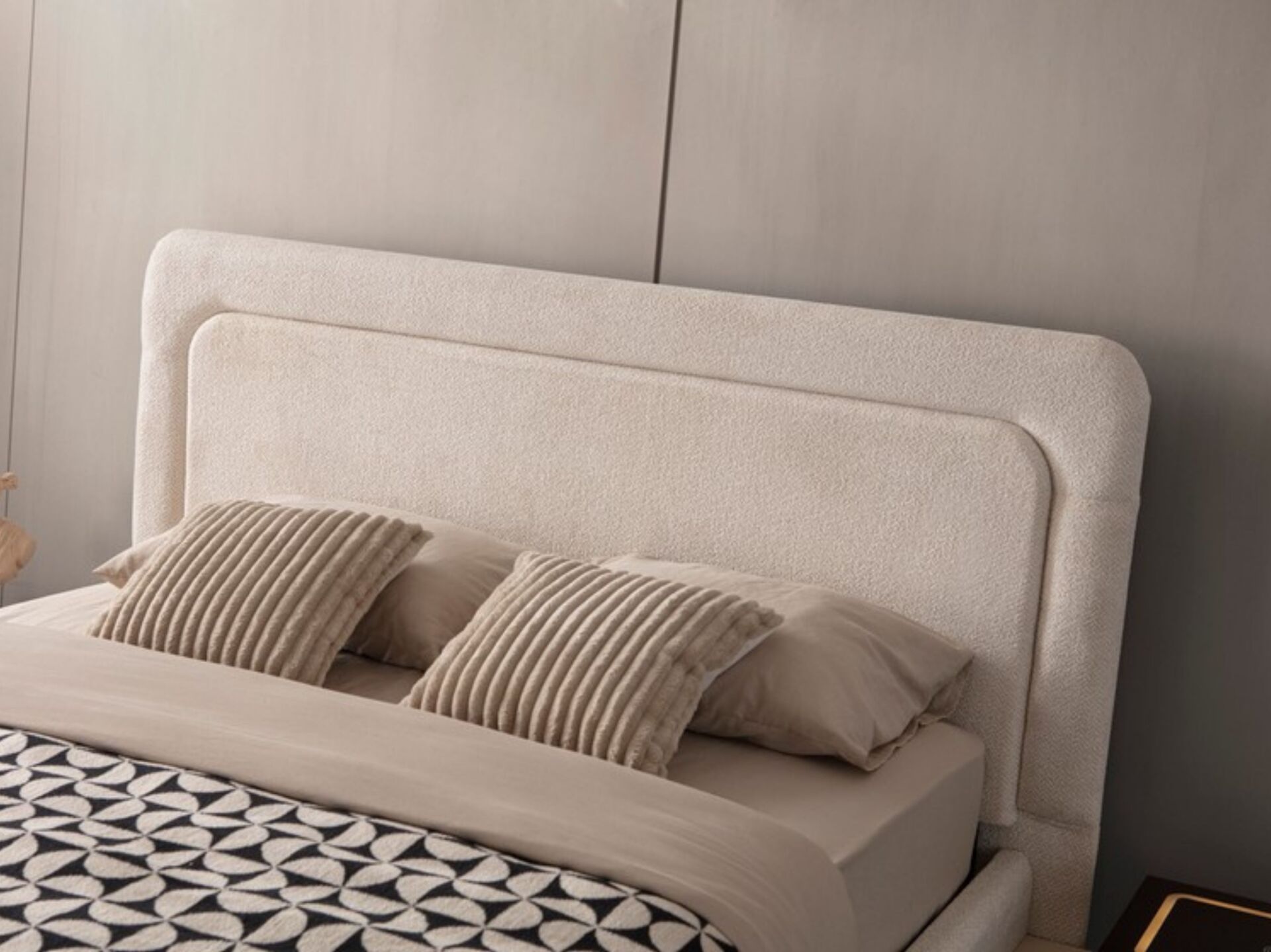 Başlık üzeri ve karyola çerçevesi kolay silinebilir, pamuklu şönil kumaşla bezenmiştir. |