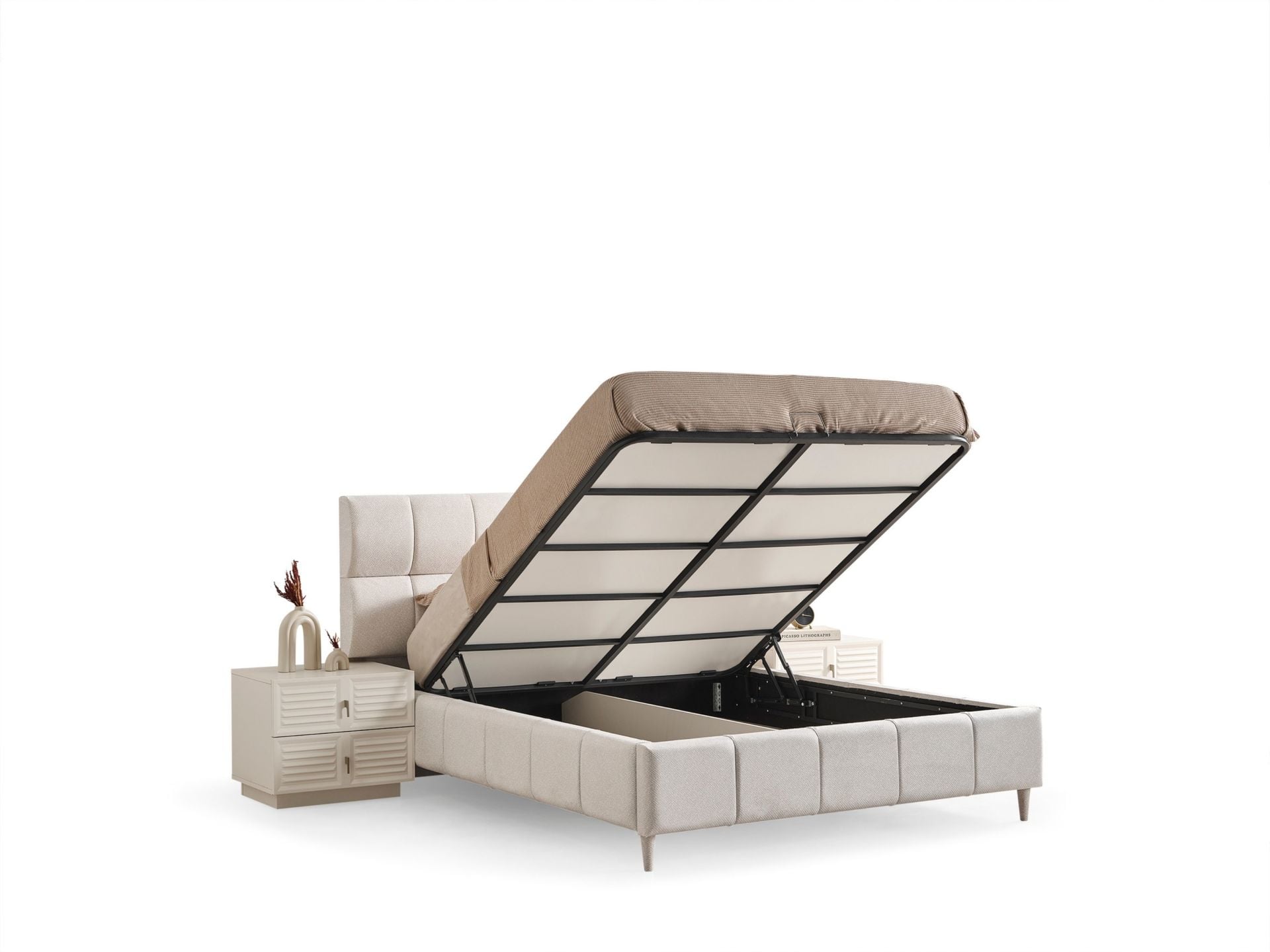 Ürün başlıklı bazalı karyola biçimindedir. Başlık ve karyola çerçevesi sünger üzeri kumaş kaplıdır. Başlık ve karyola çerçevesi yonga-levha malzemedir. Baza fonksiyonel olarak bölümlendirilmiştir.
