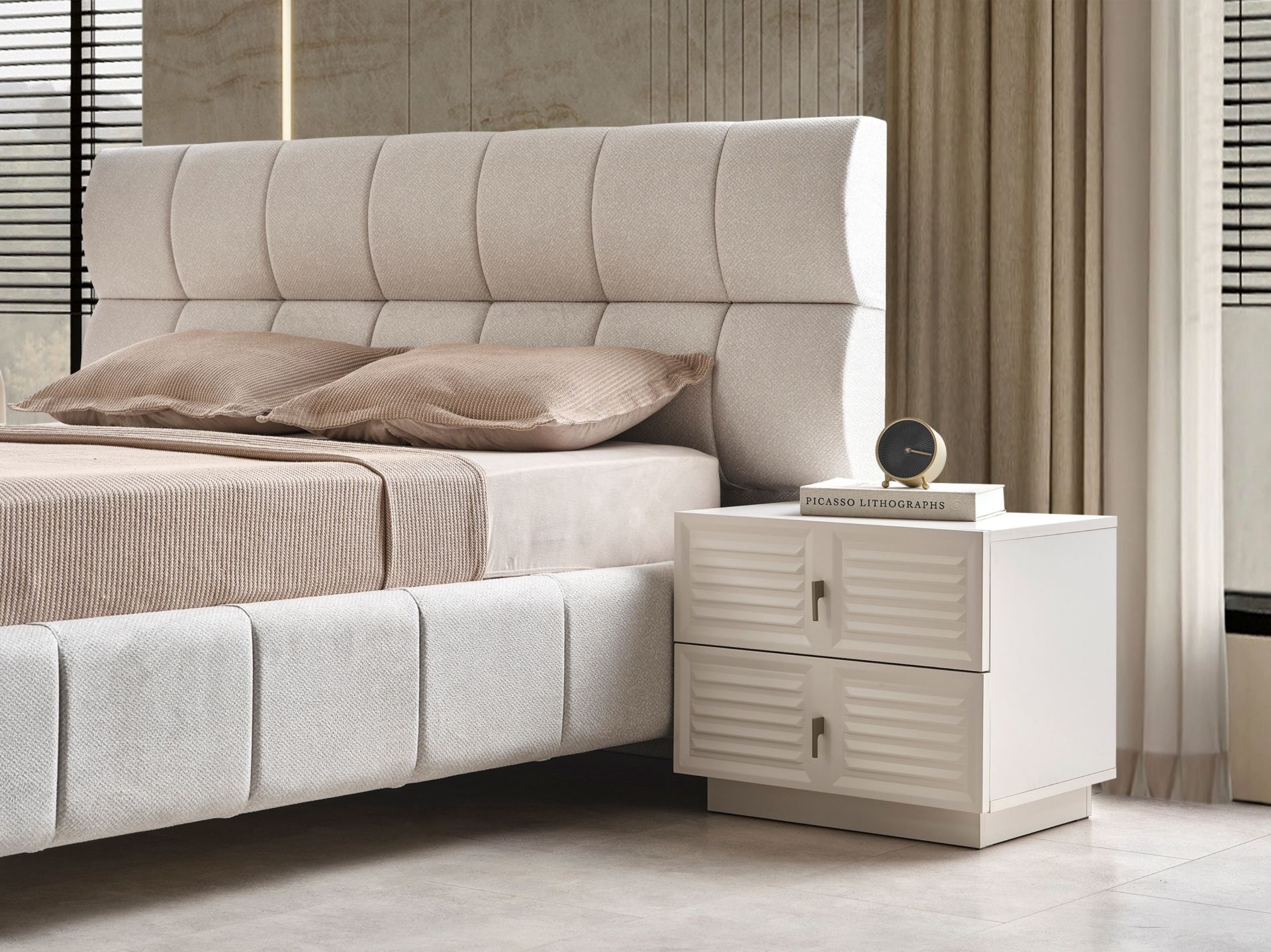 Başlık üzeri ve karyola çerçevesi kolay silinebilir, pamuklu yeni nesil kumaşla bezenmiştir. |