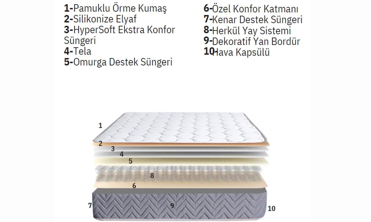 Örme kumaş, silikonize elyaf, tela, kenar destek süngeri kullanılmıştır.