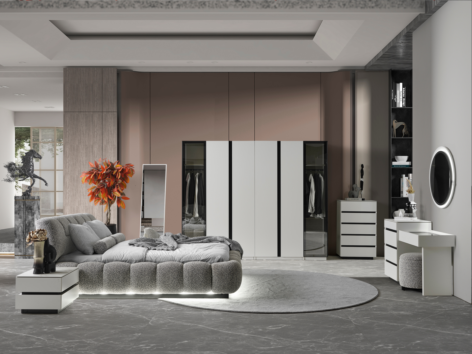 Tamamı MDF malzemeden imal edilmiştir. 5 adet raylı çekmeceye sahiptir. Üst tabla mermer desen üzeri lake kaplamadır. Sair kısımlar da lake boya kaplama olarak imal edilirler. Siyah renkli bölümler kabarma ve solma görülmeyen yeni nesil ahşap kaplama ile giydirilmiştir. |