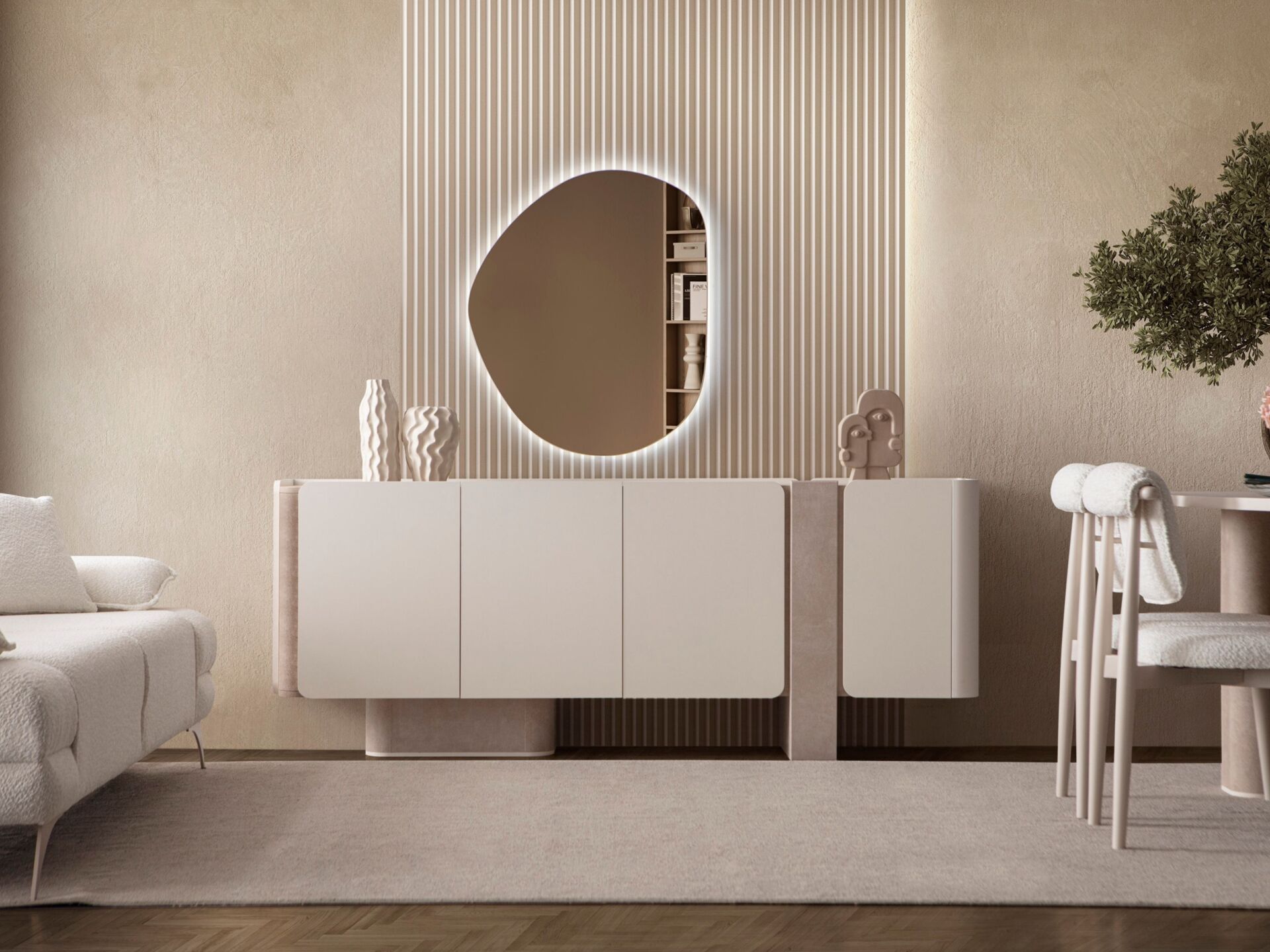 Kapaklar, tabla ve tüm dış görünür yüzeyler 1. sınıf suntelam malzemeden mamuldür. 4 adet kapaklı-raflı bölmeye sahiptir. Üst tabla mermer desen baskılı olarak imal edilmiştir. Bir kısım ayak bağlantısı ahşap iken diğer taraflar mermer baskılı ahşap malzemedir. Konsol aynası dekoratif bir tasarımla üretilmiş ve LED aydınlatma ile ışıklandırılmıştır. |