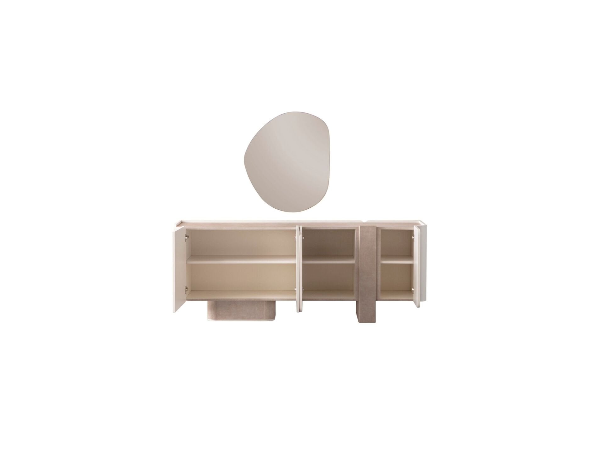 Kapaklar, tabla ve tüm dış görünür yüzeyler 1. sınıf suntelam malzemeden mamuldür. 4 adet kapaklı-raflı bölmeye sahiptir. Üst tabla mermer desen baskılı olarak imal edilmiştir. Bir kısım ayak bağlantısı ahşap iken diğer taraflar mermer baskılı ahşap malzemedir. Konsol aynası dekoratif bir tasarımla üretilmiş ve LED aydınlatma ile ışıklandırılmıştır.
