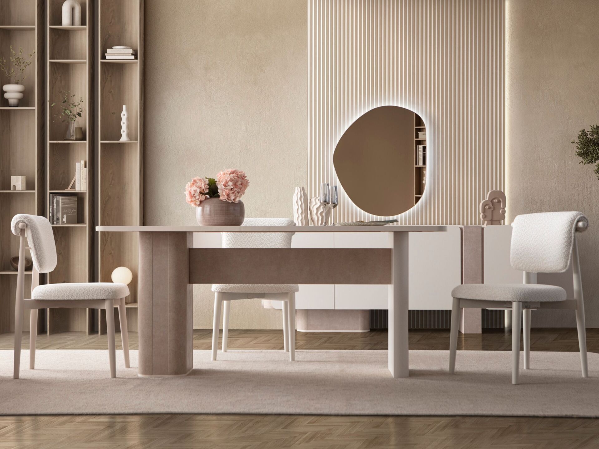 Takım içeriği 1 adet yemek masası, 6 adet sandalye, 1 adet konsol ve konsol aynasından müteşekkildir. Takım elemanlarını modüler olarak ayrı ayrı satın alabilirsiniz. |