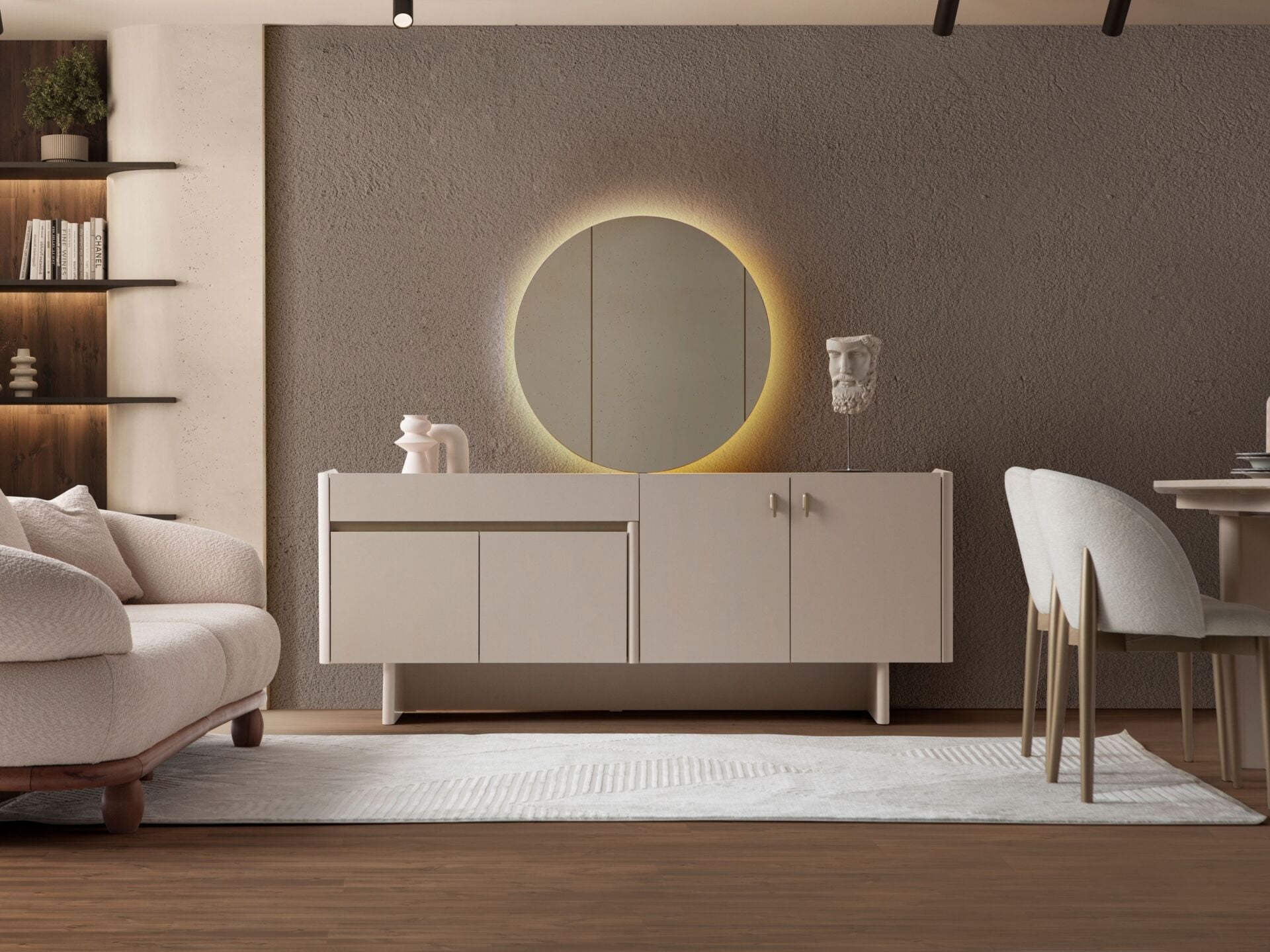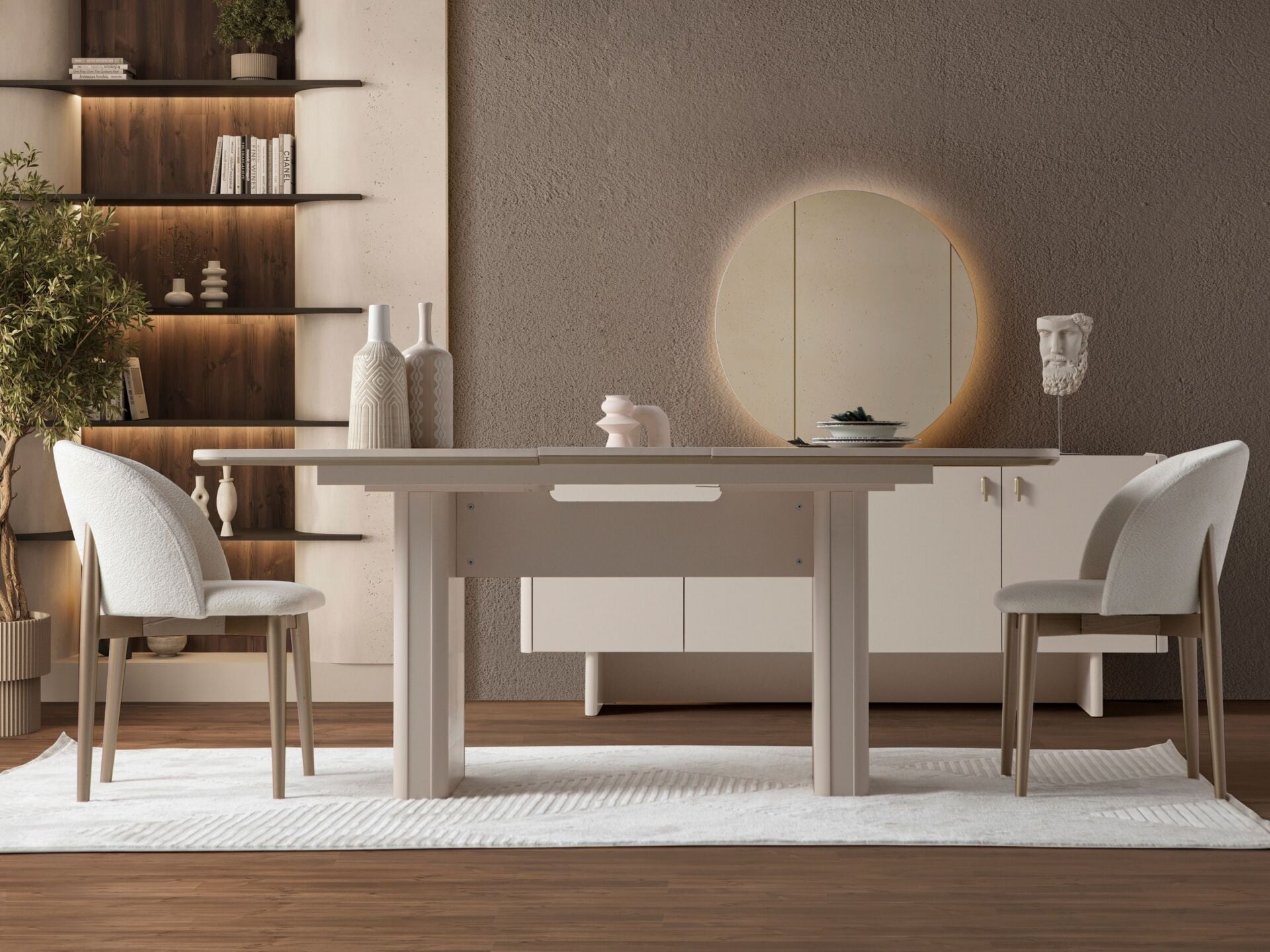 Takım içeriği 1 adet yemek masası, 6 adet sandalye, 1 adet konsol ve konsol aynasından müteşekkildir. Takım elemanlarını modüler olarak ayrı ayrı satın alabilirsiniz.