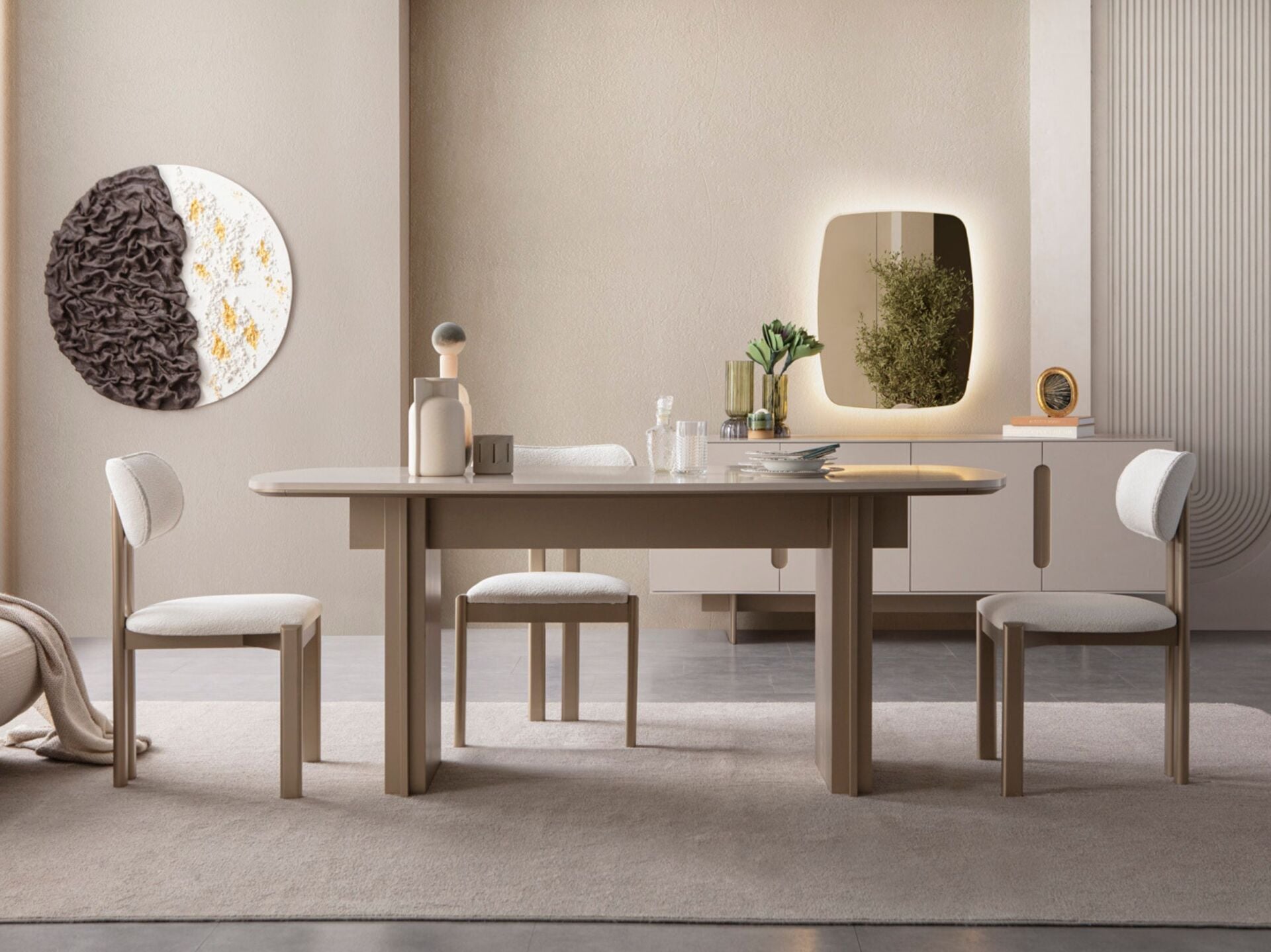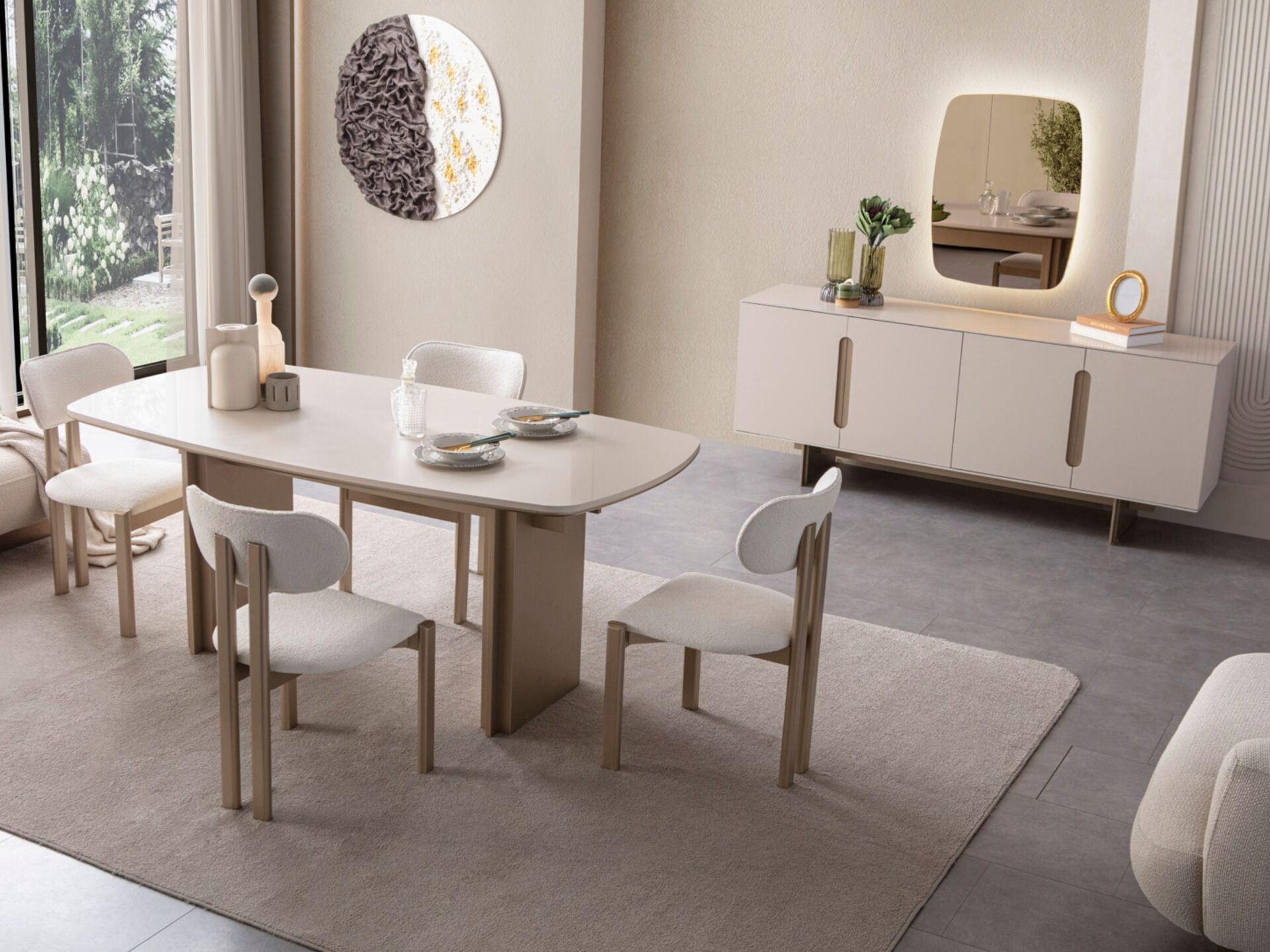 Takım içeriği 1 adet yemek masası, 6 adet sandalye, 1 adet konsol ve konsol aynasından müteşekkildir. Takım elemanlarını modüler olarak ayrı ayrı satın alabilirsiniz.