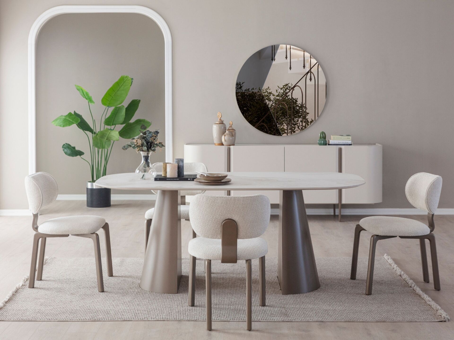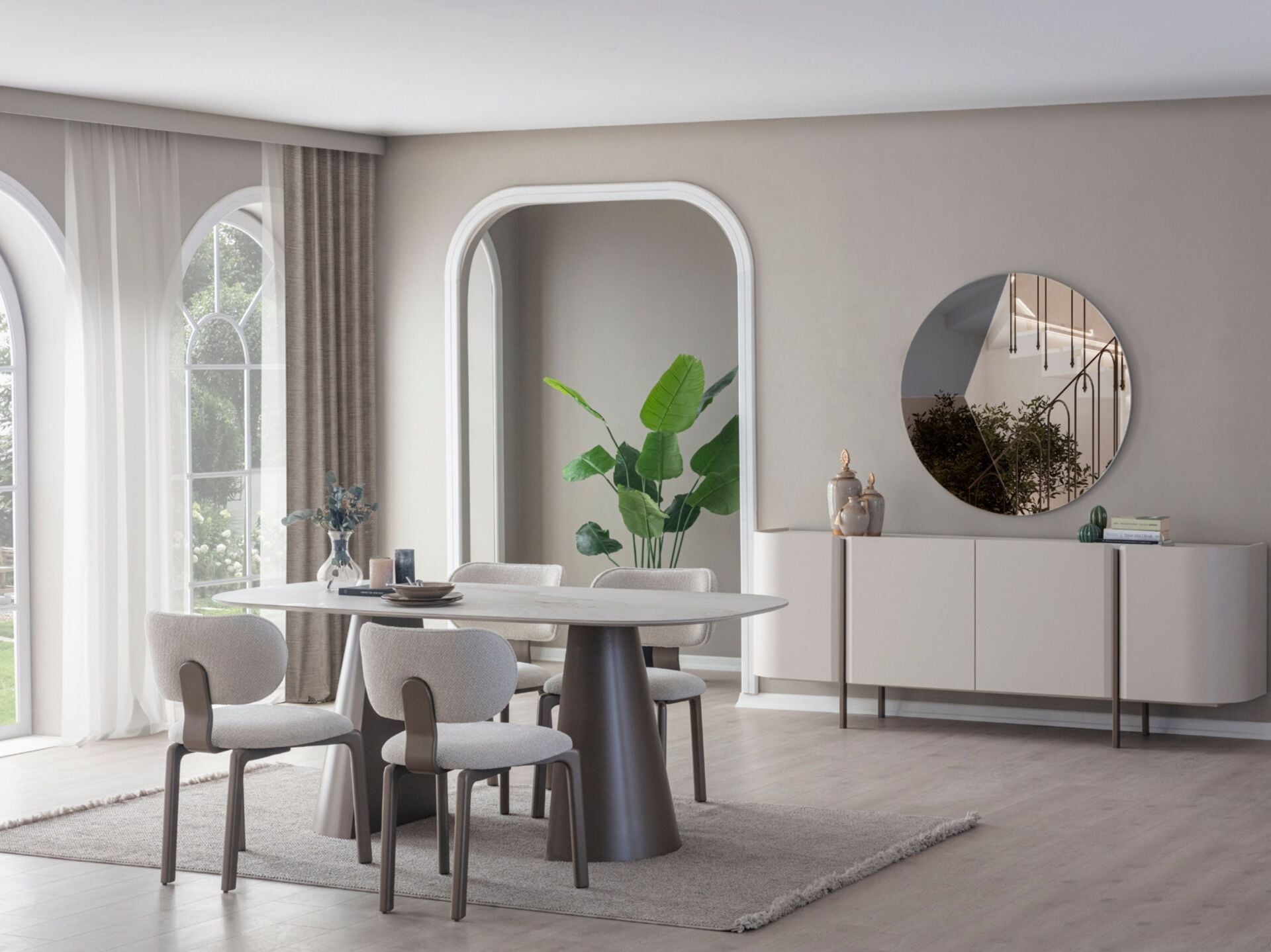 Takım içeriği 1 adet yemek masası, 6 adet sandalye, 1 adet konsol ve konsol aynasından müteşekkildir. Takım elemanlarını modüler olarak ayrı ayrı satın alabilirsiniz.