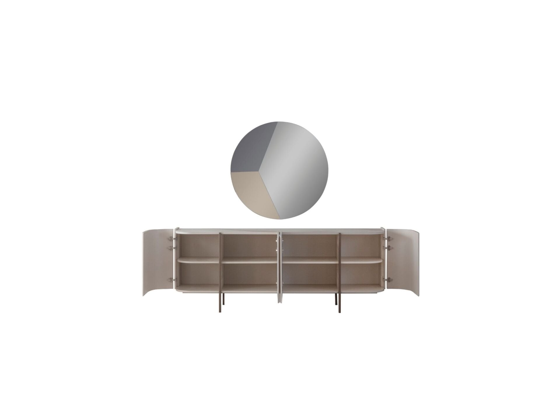 Kapaklar, tabla ve tüm dış görünür yüzeyler MDF malzemeden mamuldür. 4 adet kapaklı-raflı bölmeye sahiptir. Üst tabla mermer desen baskılı olarak imal edilmiştir. Ayak bağlantıları boyalı ahşap malzemedir. Konsol aynası dekoratif bir tasarımla üretilmiştir.