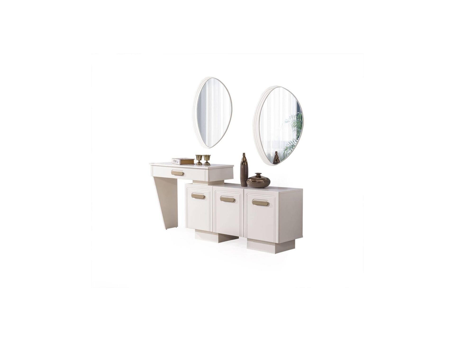 Konsol Özelliği Kapaklar, tabla ve tüm ön yüzeyler MDF malzemeden mamuldür. 3 adet kapaklı-raflı bölmeye sahiptir. 1 adet çekmeceye sahiptir. Üst tabla MDF malzeme olup çizilmelere karşı dayanıklı imal edilmiştir. Ayak bağlantıları ahşap malzemedir.  Konsol aynası dekoratif bir tasarımla üretilmiştir. Kulplar metal malzemedir.