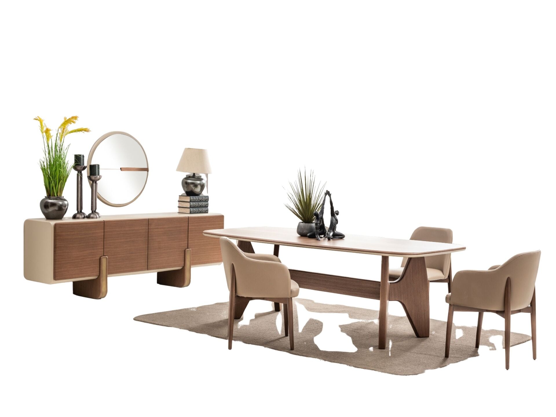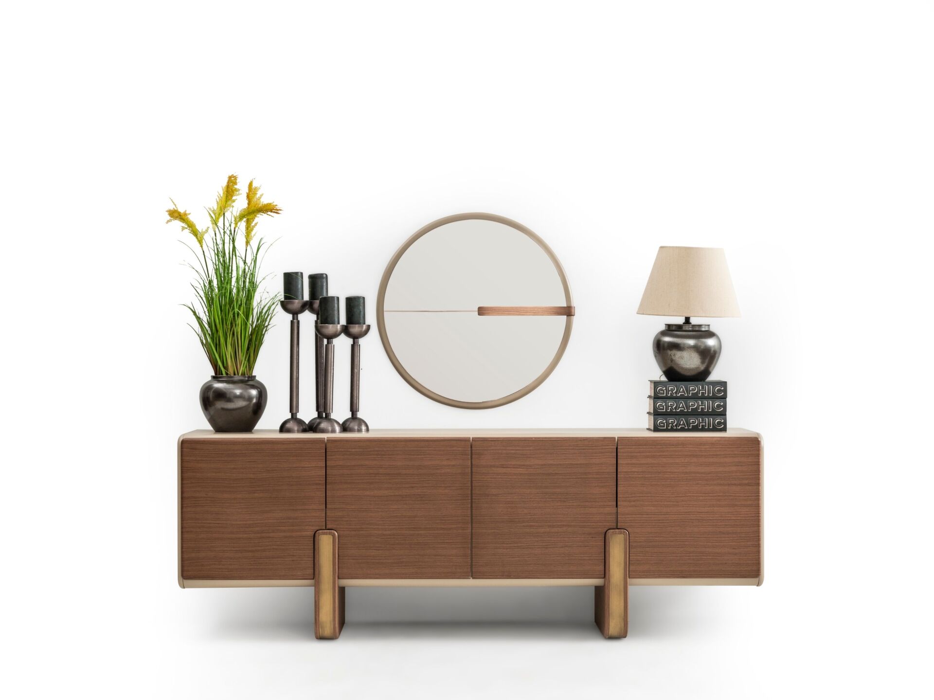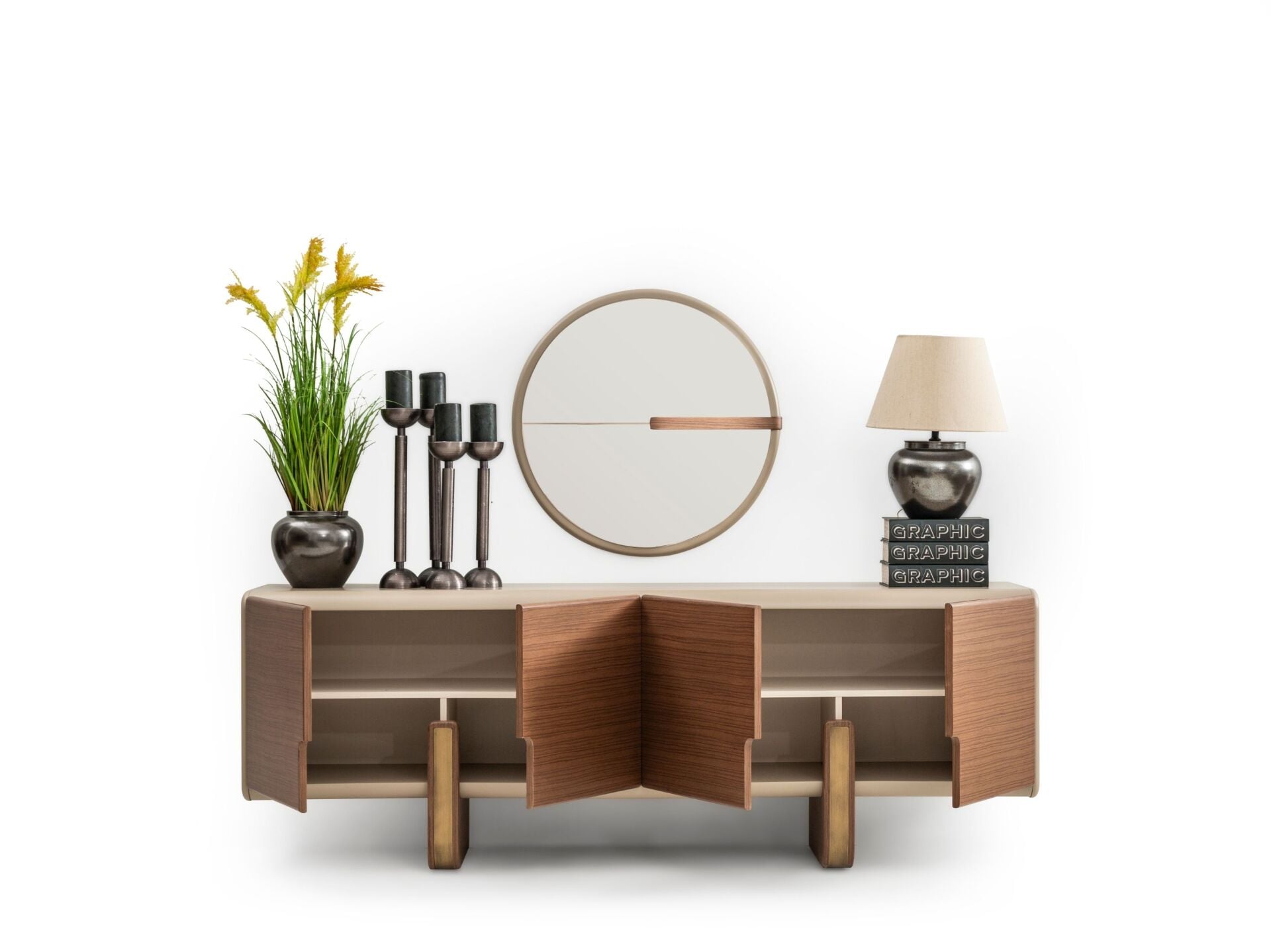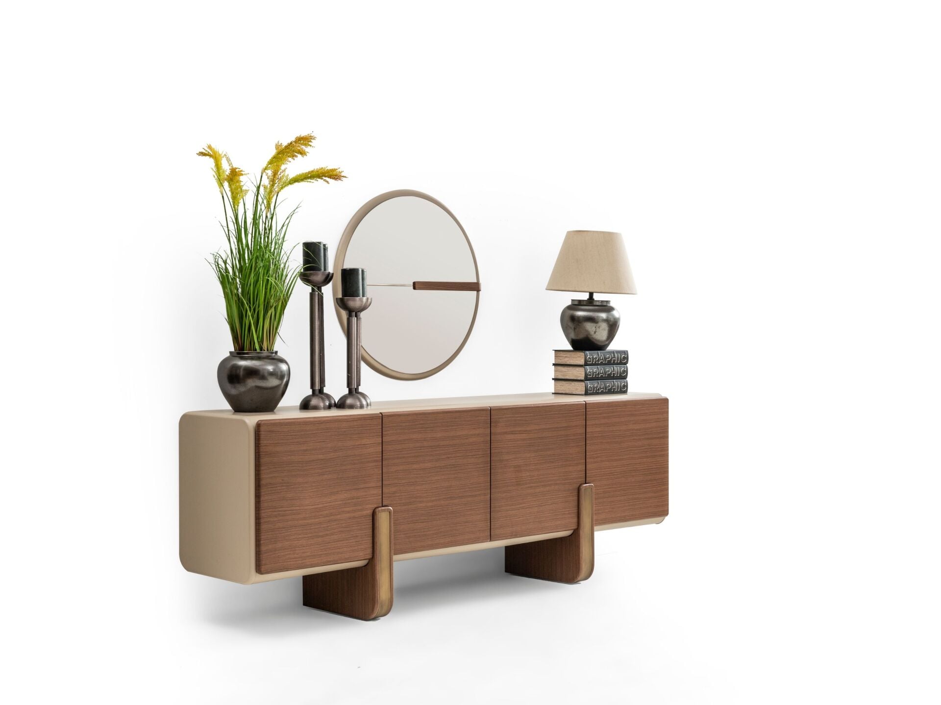 Kapaklar, tabla ve tüm dış görünür yüzeyler MDF malzemeden mamuldür. 4 adet kapaklı-raflı bölmeye sahiptir. Üst tabla yeni nesil boyalı olarak imal edilmiştir. Bir kısım ayak bağlantısı ahşap malzemedir. Konsol aynası dekoratif bir tasarımla üretilmiştir.