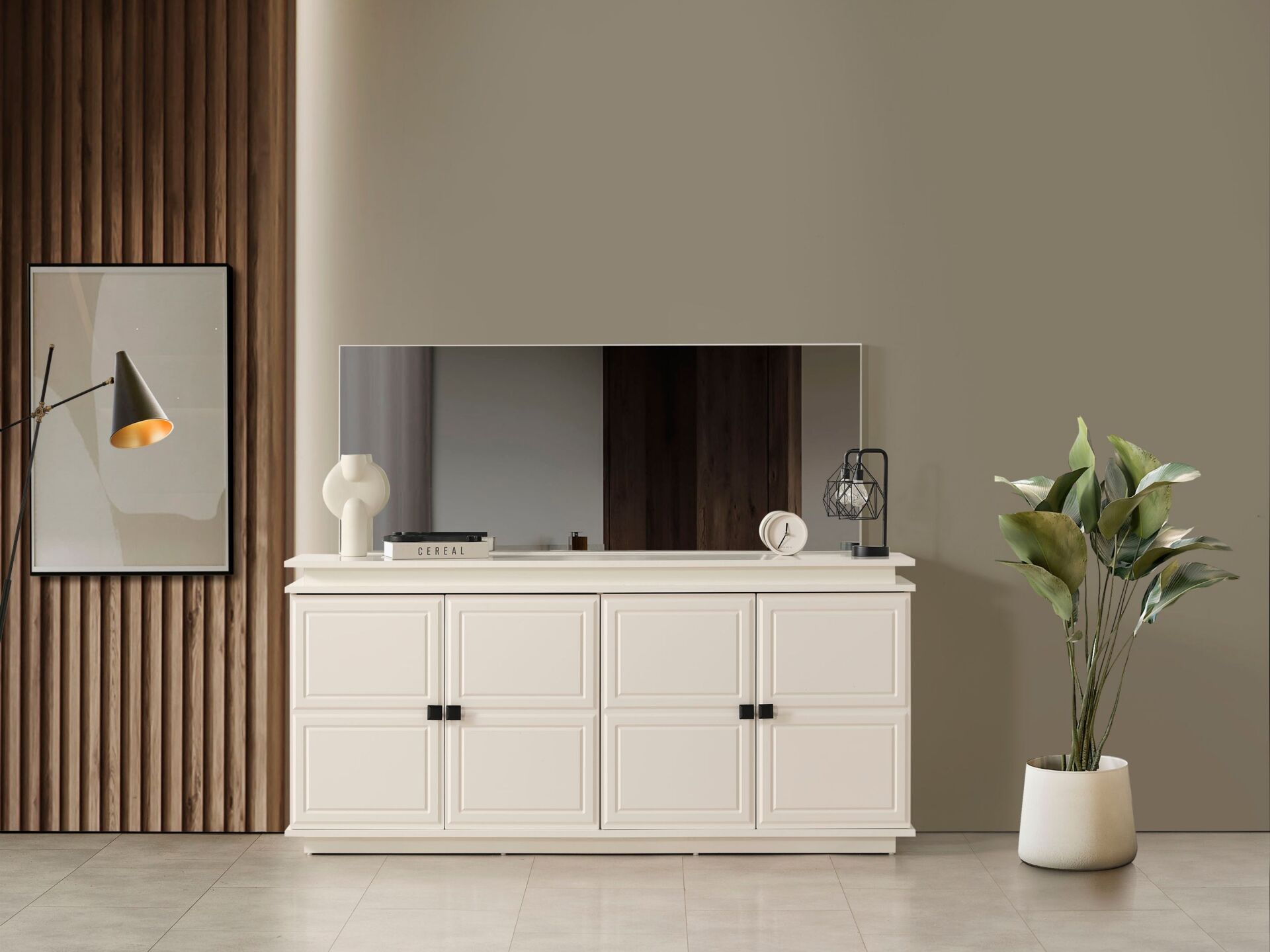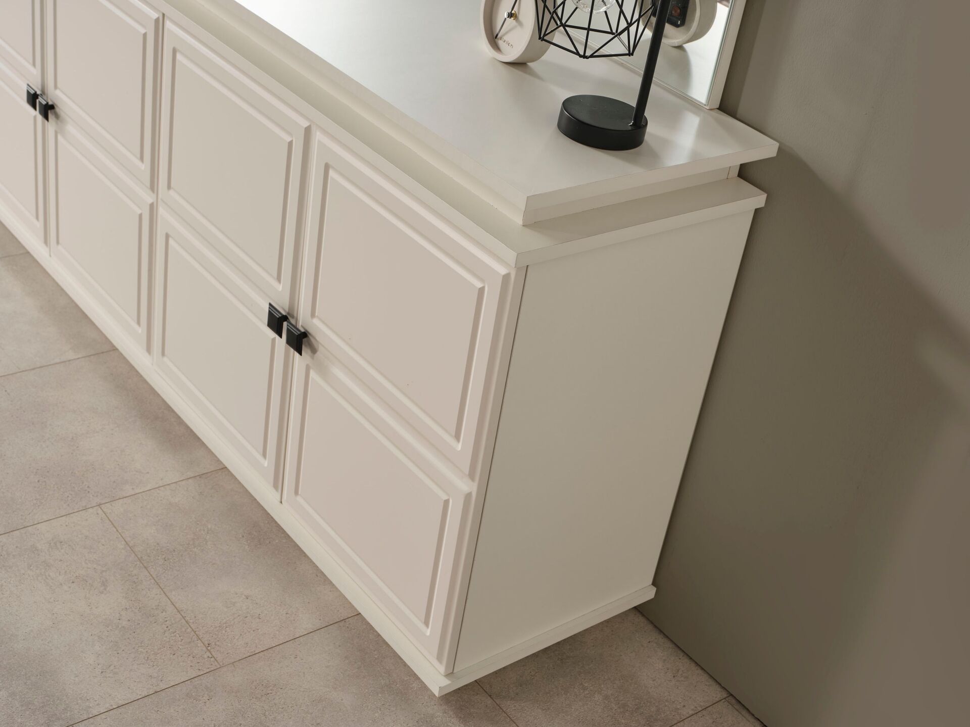 Konsol Özelliği Kapaklar, tabla ve tüm ön yüzeyler MDF malzemeden mamuldür. 4 adet kapaklı-raflı bölmeye sahiptir. Üst tabla MDF malzeme olup çizilmelere karşı dayanıklı imal edilmiştir. Ayak bağlantıları ahşap malzemedir.  Konsol aynası dekoratif bir tasarımla üretilmiştir. Kulplar metal malzemedir.