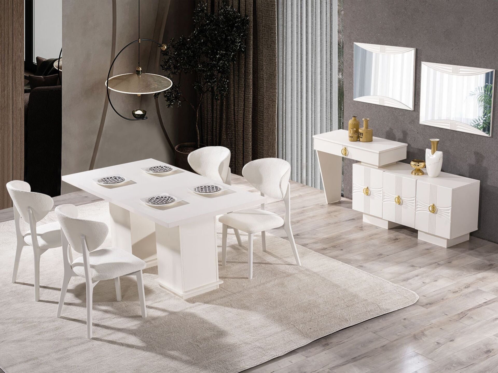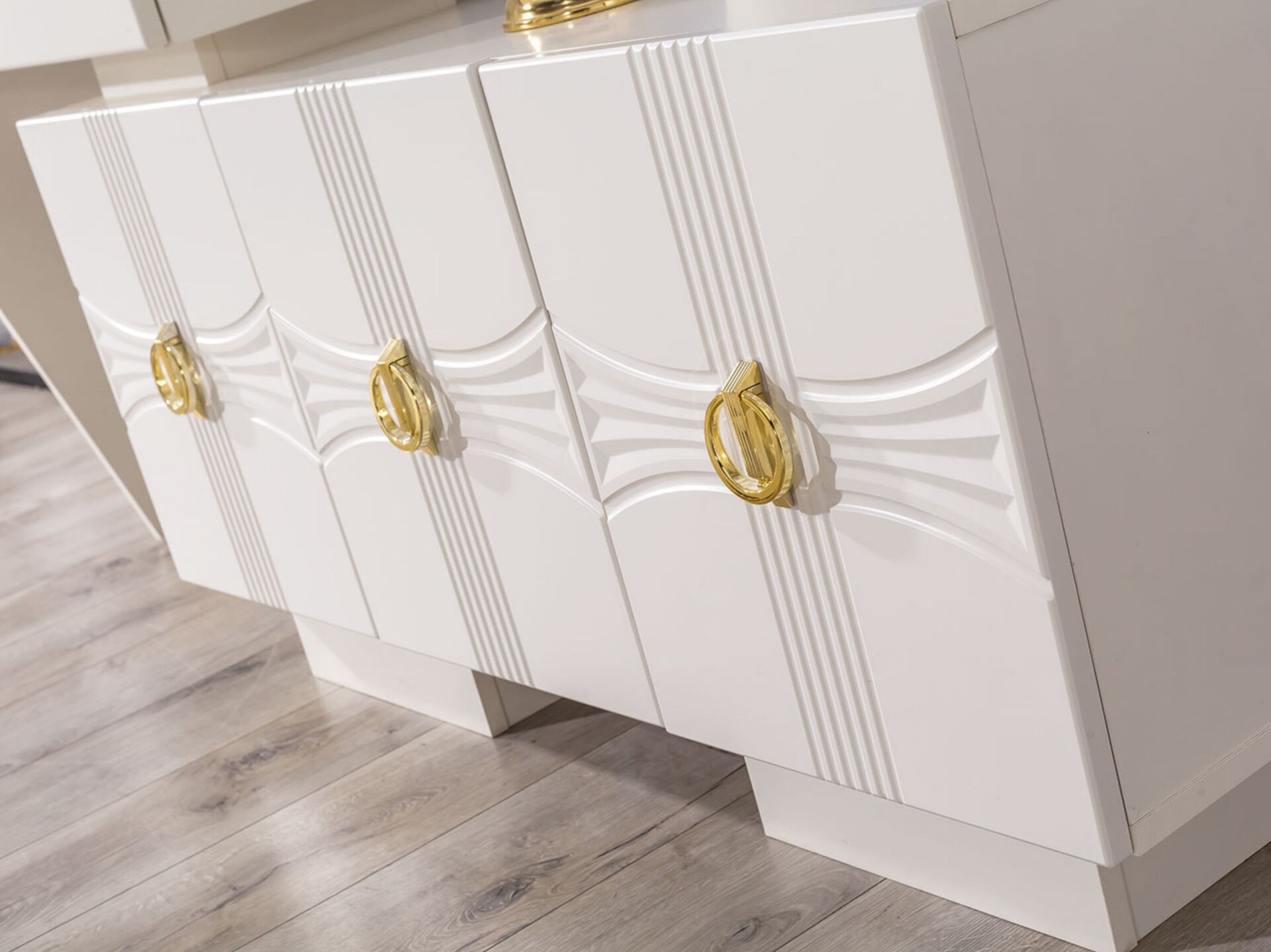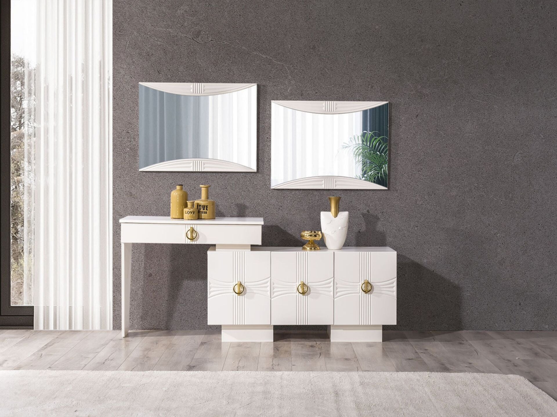Konsol Özelliği Kapaklar, tabla ve tüm ön yüzeyler MDF malzemeden mamuldür. 3 adet kapaklı-raflı bölmeye sahiptir. 1 adet çekmeceye sahiptir. Üst tabla MDF malzeme olup çizilmelere karşı dayanıklı imal edilmiştir. Ayak bağlantıları ahşap malzemedir.  Konsol aynası dekoratif bir tasarımla üretilmiştir. Kulplar metal malzemedir.