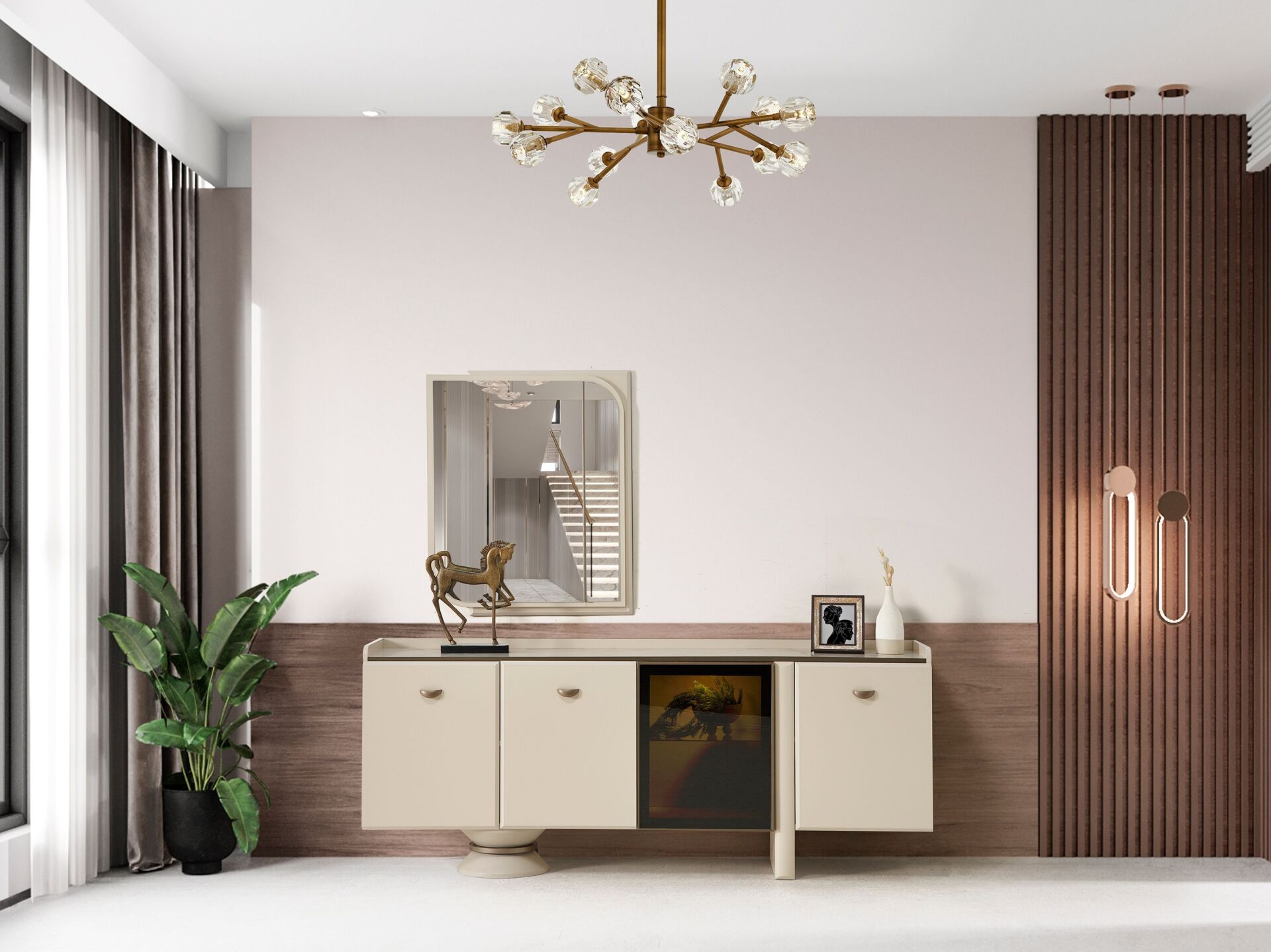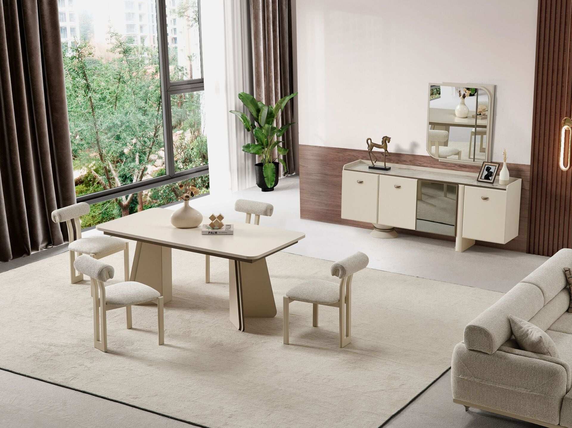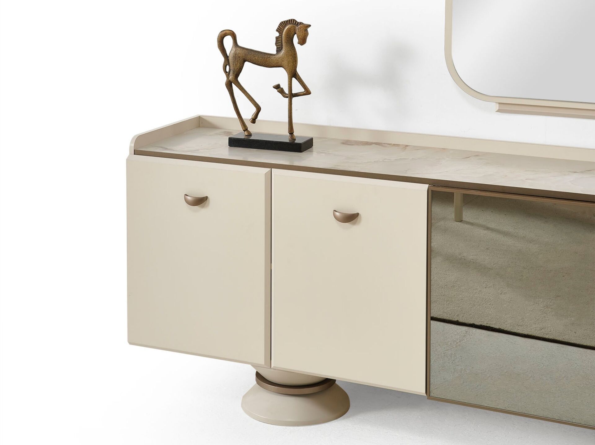 Kapaklar, tabla ve tüm dış görünür yüzeyler 1. sınıf suntelam malzemeden mamuldür. 4 adet kapaklı-raflı bölmeye sahiptir. Ayak bağlantılarının tamamı ahşap malzemeden üzerilmektedir. Konsol aynası dekoratif bir tasarımla üretilmiştir. Kulplar metal malzemedir.