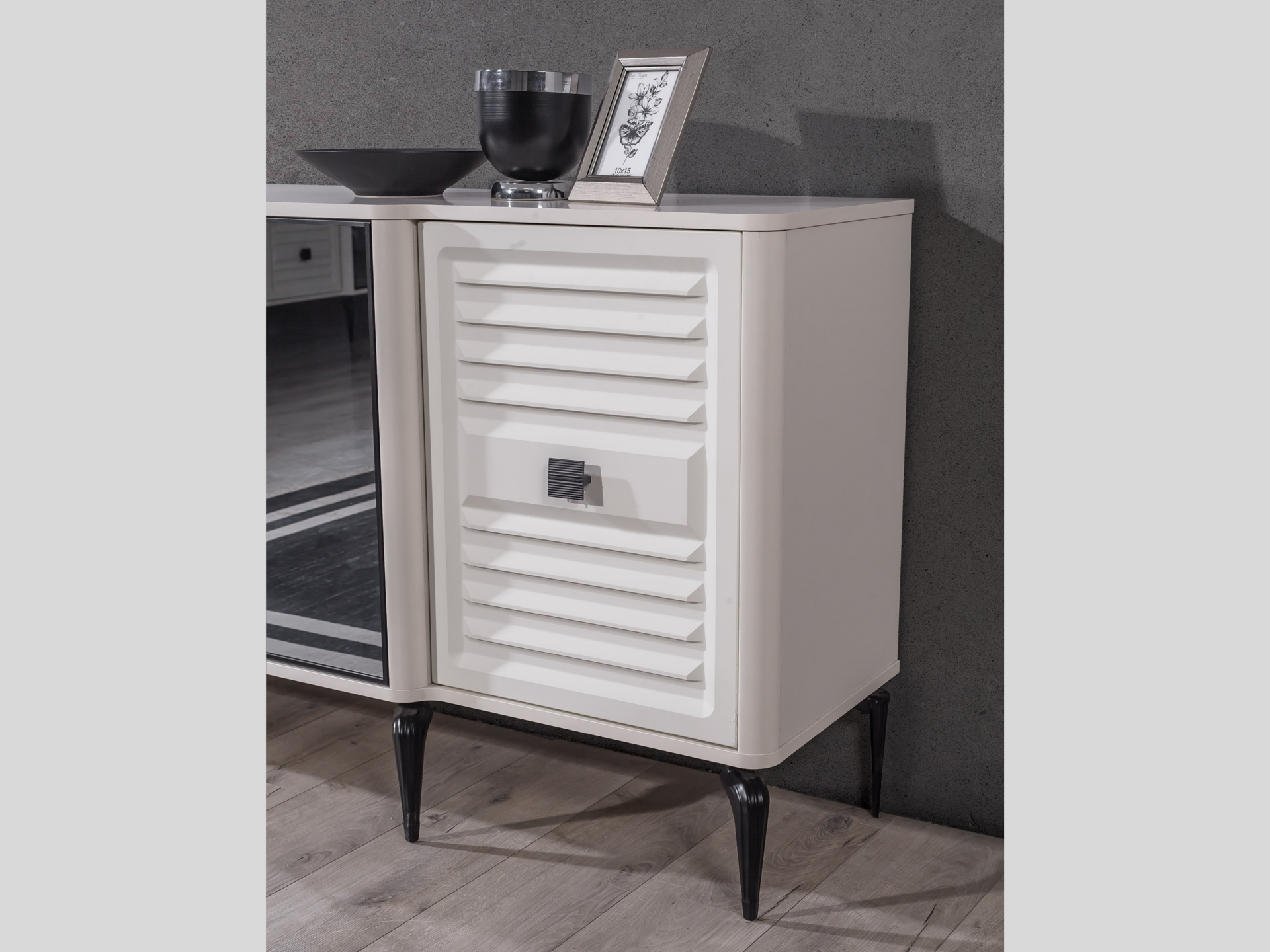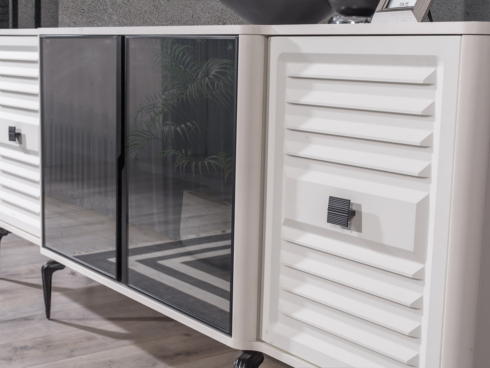 Kapaklar ve tabla MDF malzemeden mamuldür. 4 adet kapaklı bölmeye sahiptir. Orta iki kapak temperlenmiş, kalın, aynalı camdan ibarettir. Lake kaplama olarak imal edilmiştir. Ayak bağlantıları metal malzemedir. Kulplar metal olarak imal edilir.