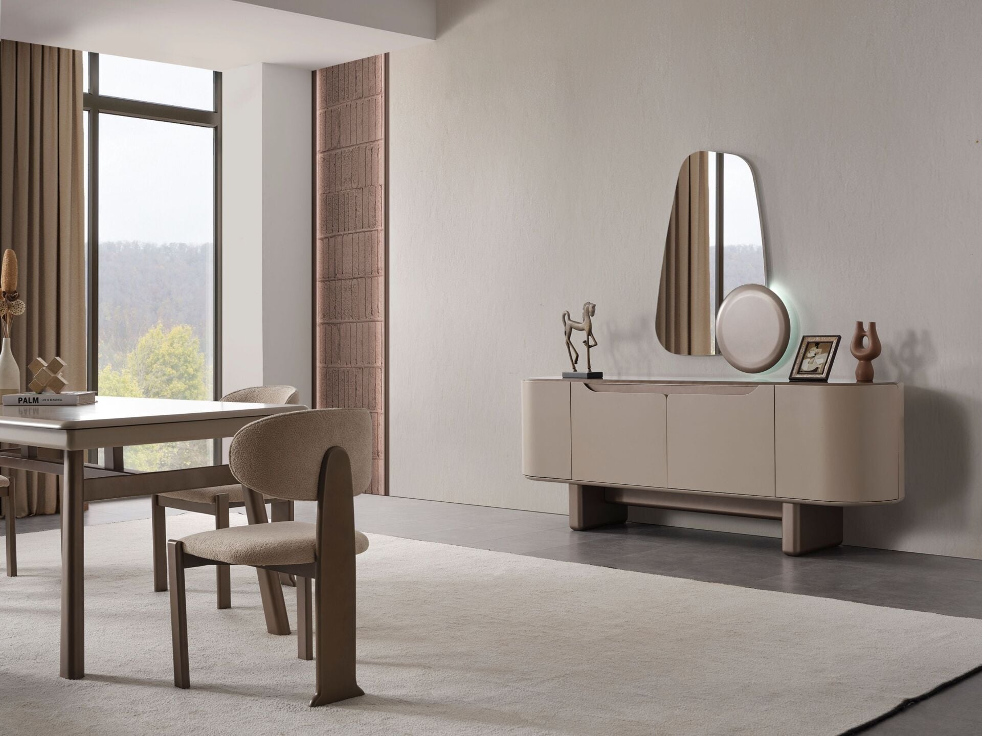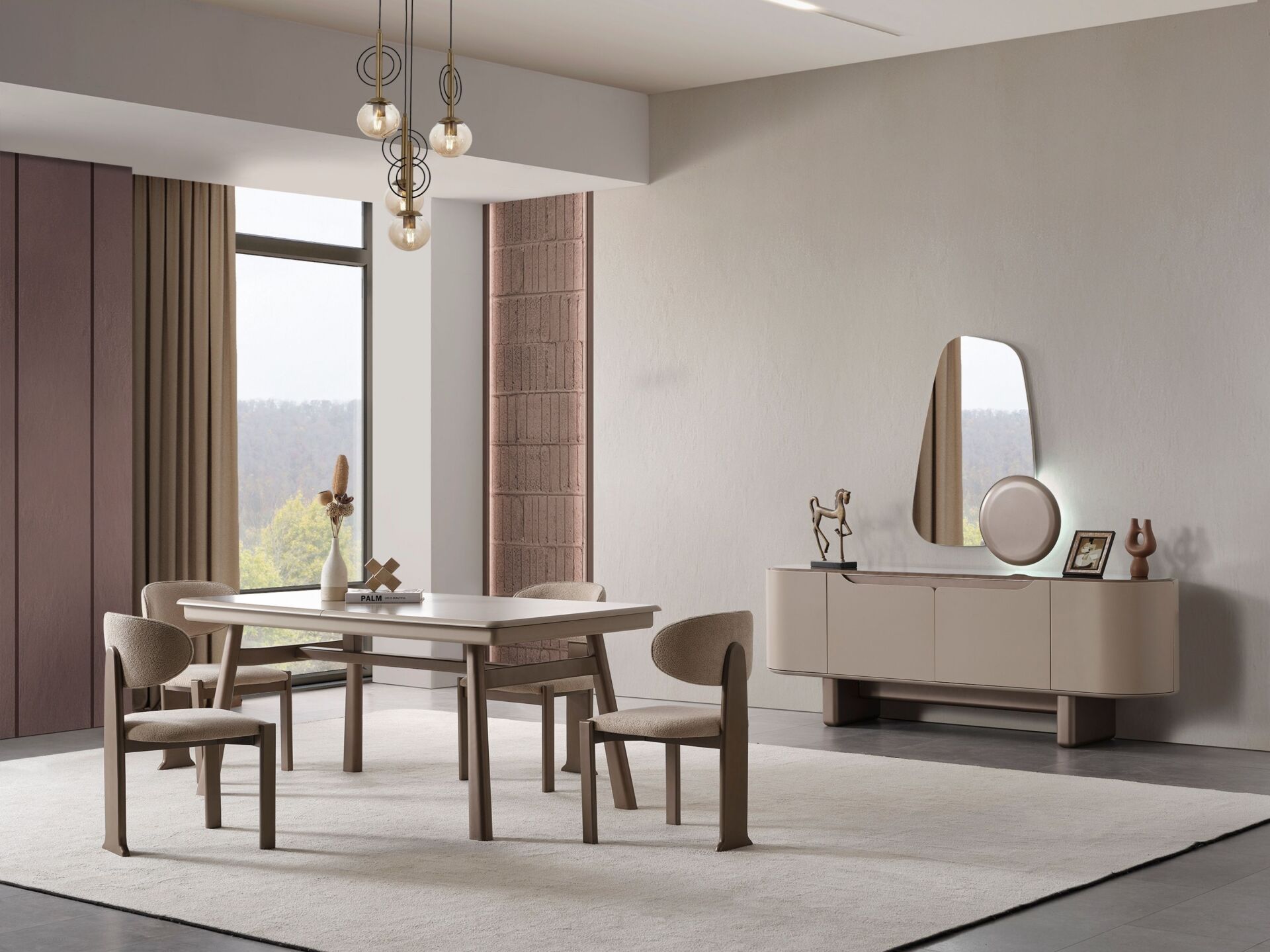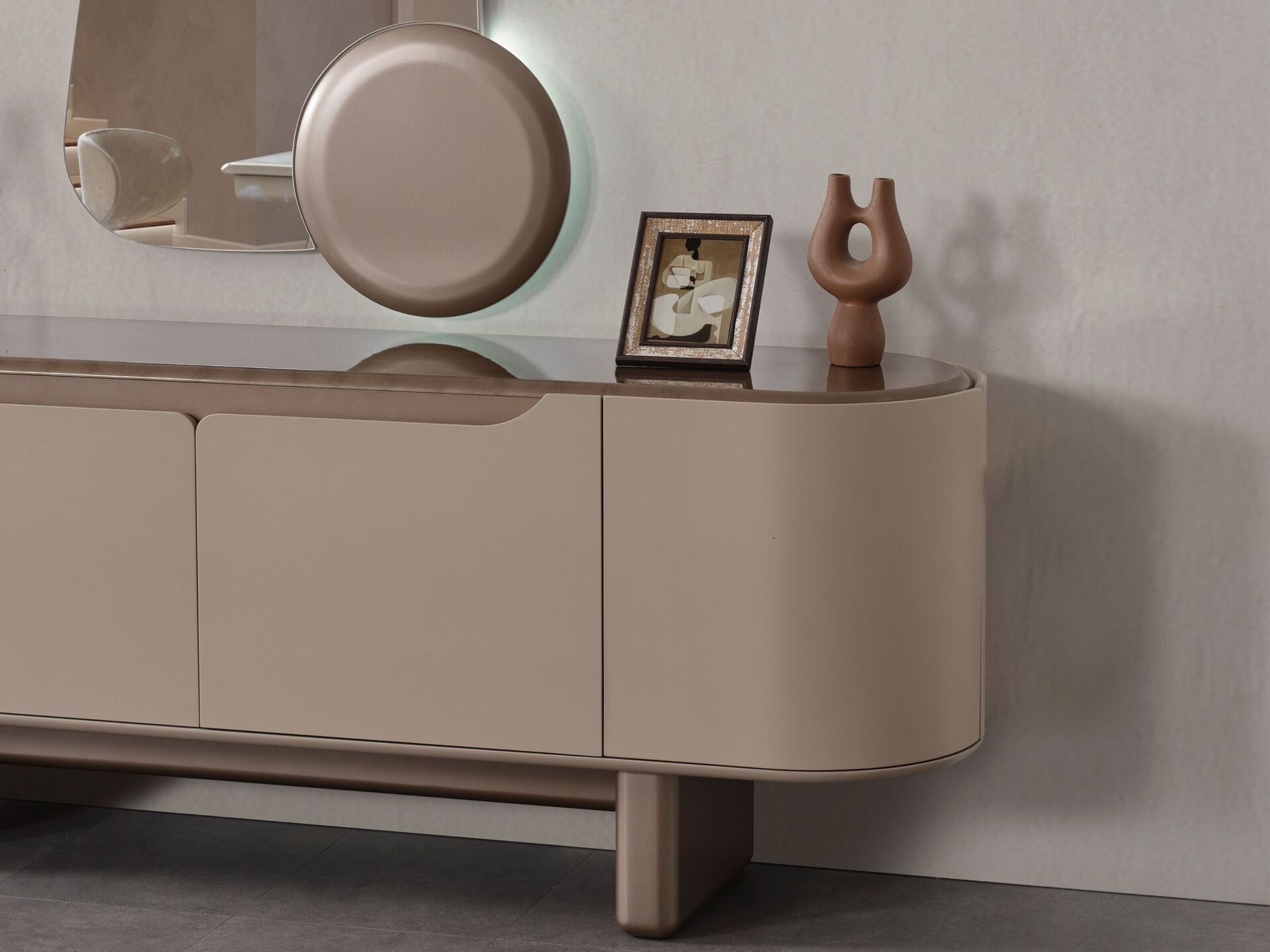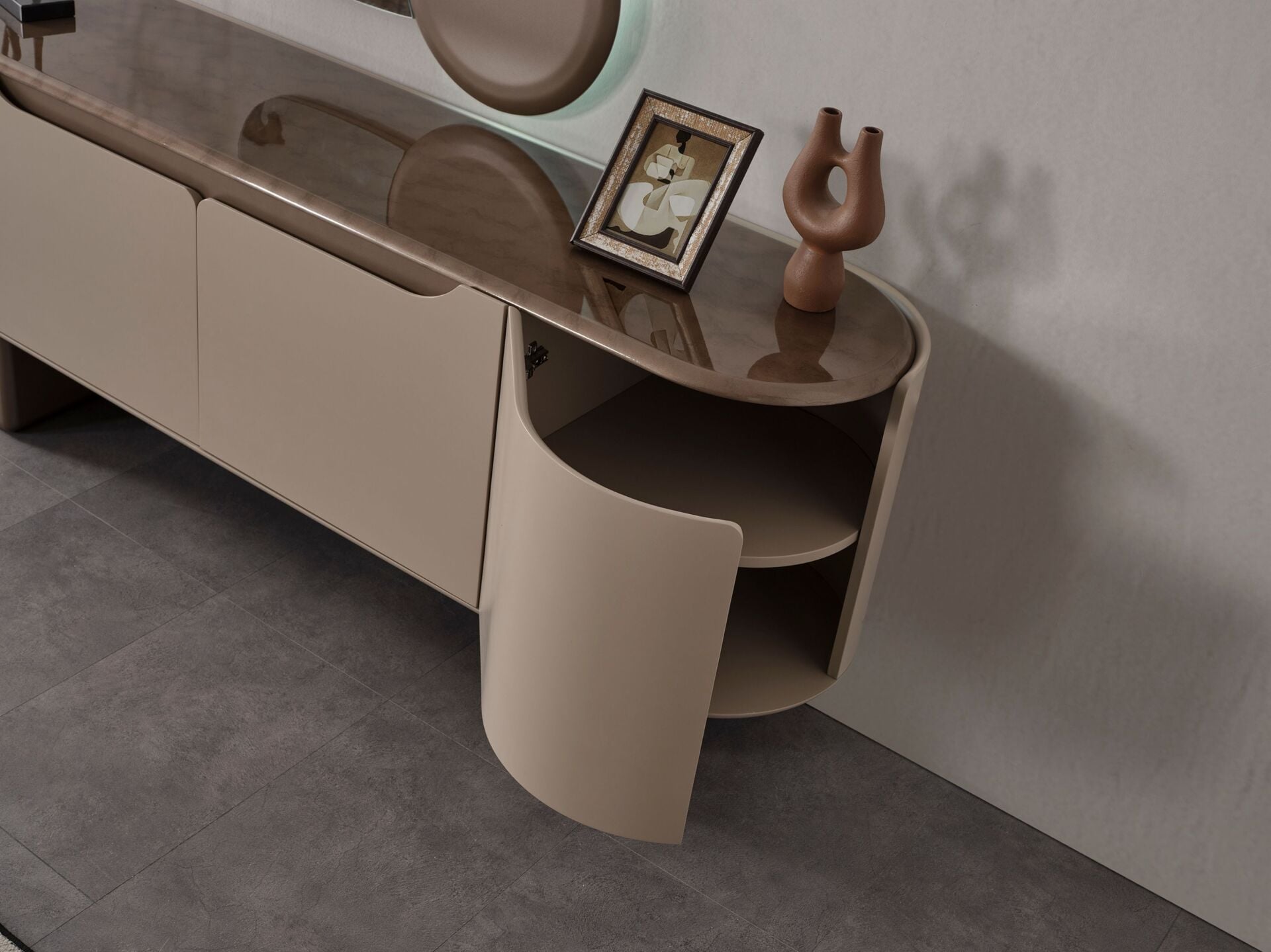 Kapaklar, tabla ve tüm dış görünür yüzeyler MDF malzemeden mamuldür. 4 adet kapaklı-raflı bölmeye sahiptir. Tüm dış görünür yüzeyler yeni nesil boyalı olarak üretilmektedir. Ayak bağlantıları ahşap malzemeden üretilmiş olup yeni nesil renk boyama tekniği ile boyanmıştır. Konsol aynası dekoratif bir tasarımla üretilmiştir.