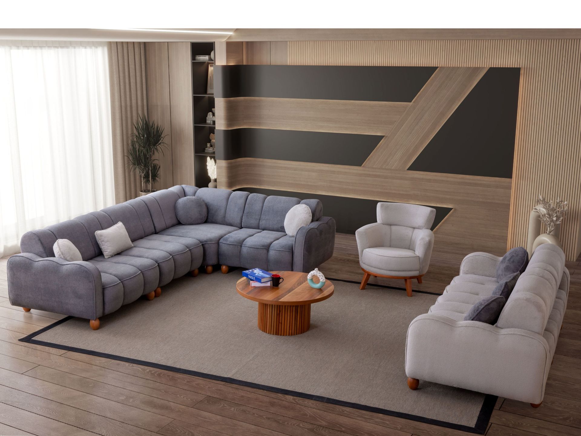 Takım içeriği 1 adet köşe koltuk ve berjerden müteşekkildir. Köşe Koltuk 2 Adet kollu modül , 1adet ara modül ve 1 adet köşe modülden oluşmaktadır.