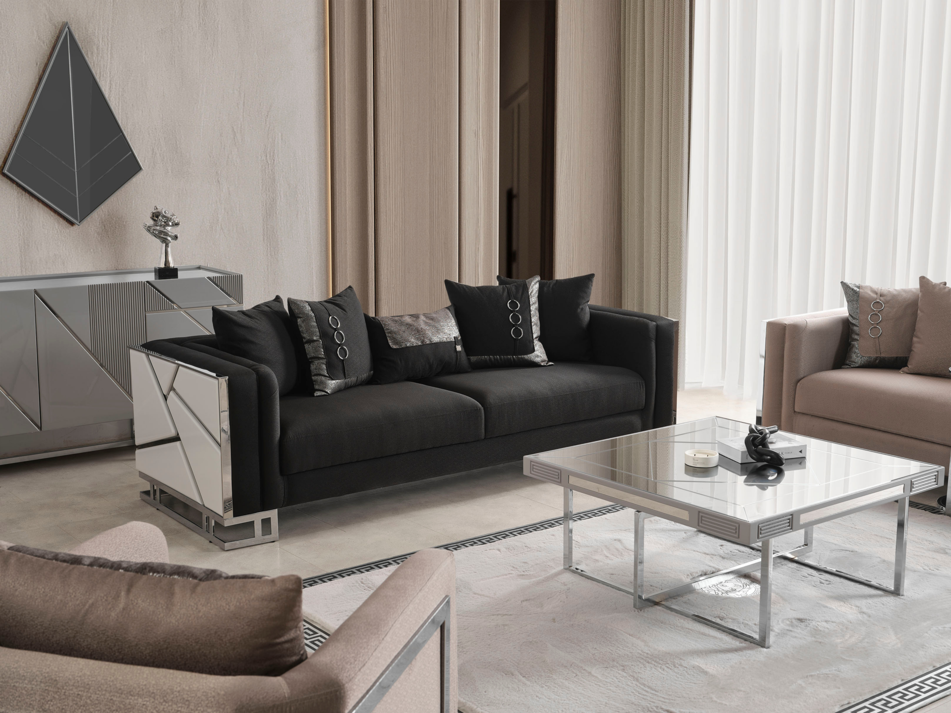 Bir adet üçlü koltuğun dış yüzeyi dekoratif ölçülendirilmiş MDF malzemenin lake delüx boya ile kaplanması suretiyle imal edilmiştir. Eşsiz bir estetik dizayna sahiptir. Kumaş türü, renk, ölçü gibi hususlarda değişiklik talebiniz olursa dilediğiniz vakit müşteri temsilcilerimize iletebilirsiniz. Ölçü değişikliği her ürün için mümkün olmayabilir.